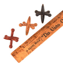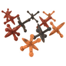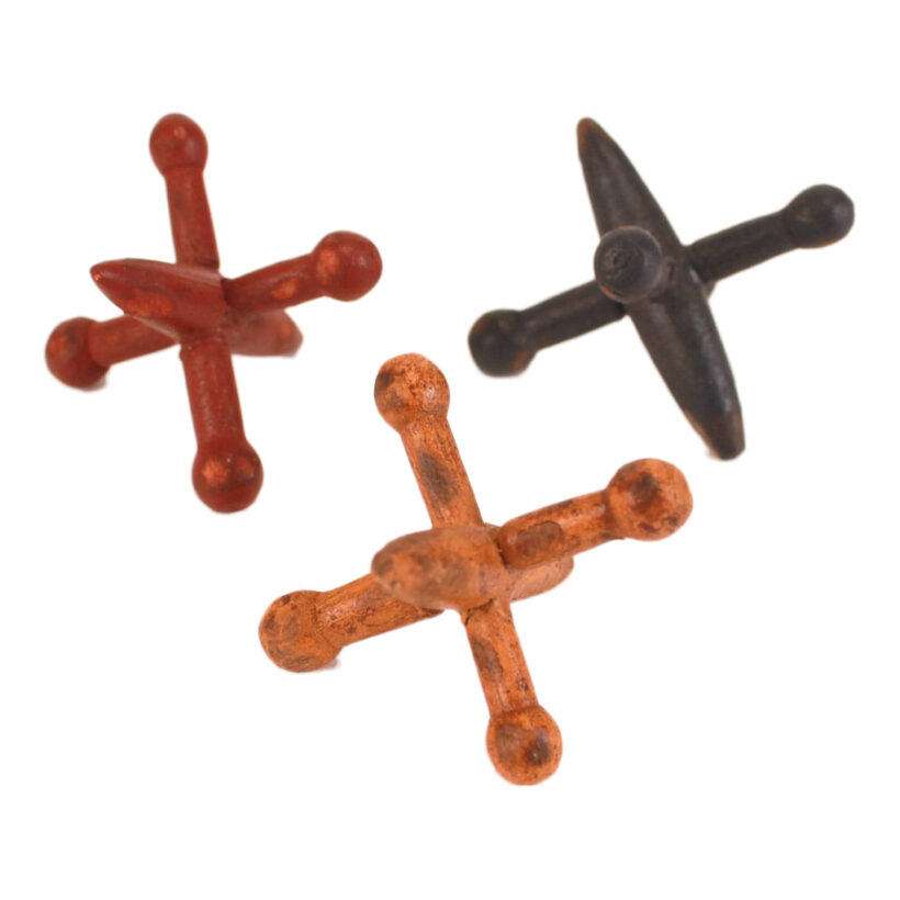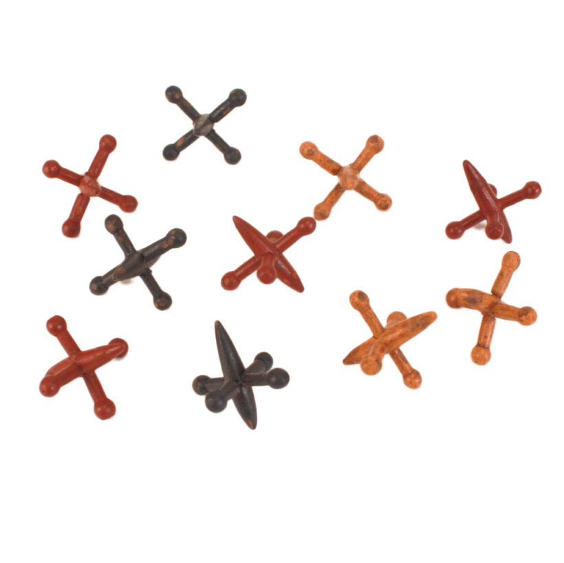 Complete set of ten hand-carved and painted toy jacks, c. 1900. Typically made of metal, these jacks are made of wood, and clearly the product of skillful woodworker. Lightweight and delicate (though apparently hardy enough to stand the test of time), these six-pronged figures comprise the pieces of the classic children’s game of Jacks.