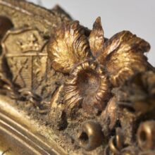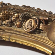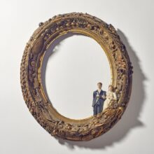 Folk art memoryware frame representing a marriage, c. 1930s. This unusual memory assemblage is clearly not composed of random objects, but those of symbolic importance to its maker. Charm bracelet wedding rings, military badges, utensils, fishing lures, seashells, china fragments, necklaces, subway tokens, keys, a heart-shaped padlock, a policeman’s button: united in one mass by a thick layer of gold radiator paint, they all seem to tell a story. The only unpainted object is the couple’s porcelain cake topper, which stands in the assemblage as if ankle-deep in the surf of their shared experiences.
