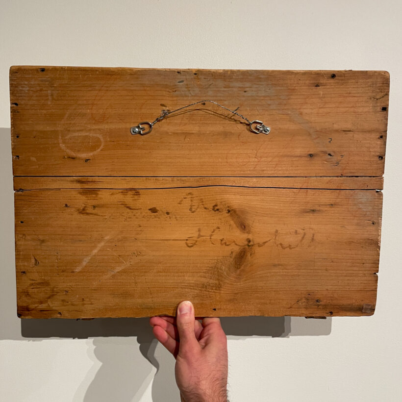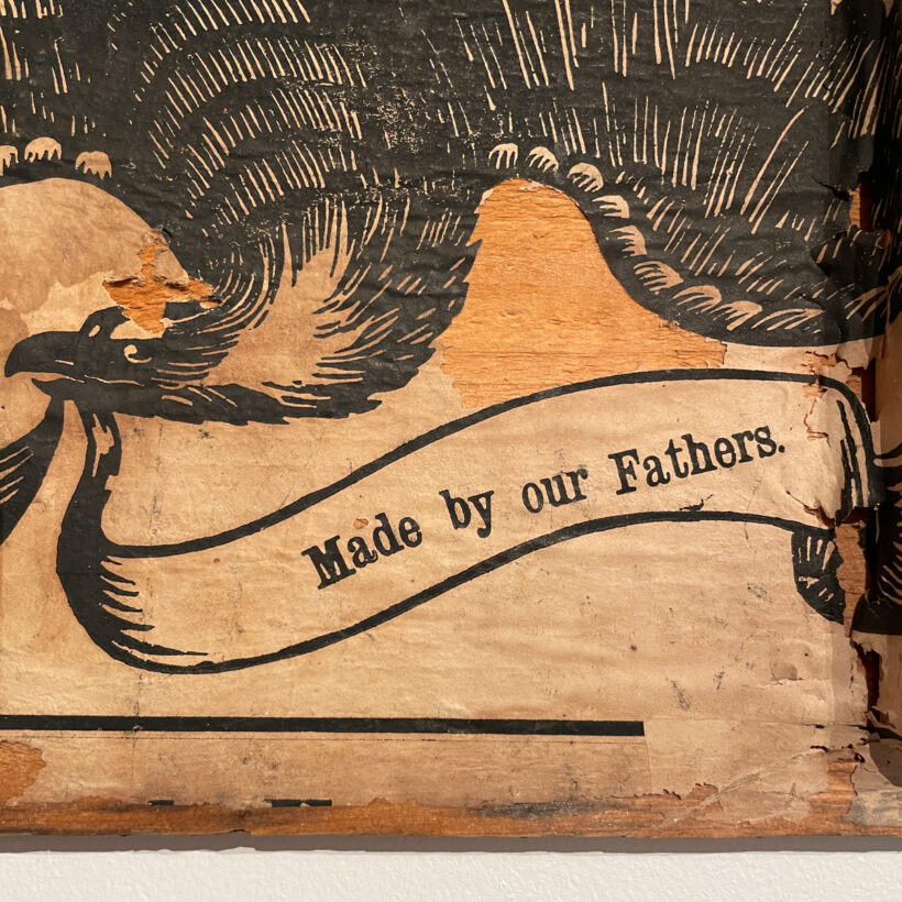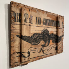 Discovered in the attic of a New Hampshire homestead and hidden for a century and a half in the interior of a nondescript trunk, this box lid preserves what appears to be a rare 1864 presidential election campaign broadside for Abraham Lincoln and Andrew Johnson, its slogan recapitulating lines from Johnson’s published speeches in order to tout the National Union Party ticket. Whether considered in light of its historical moment or out of context as a found object, the piece is a powerful and timeless call to uphold American founding principles.