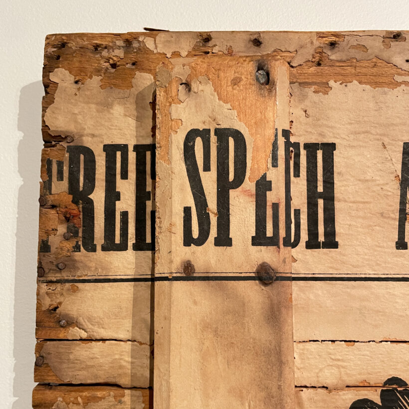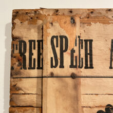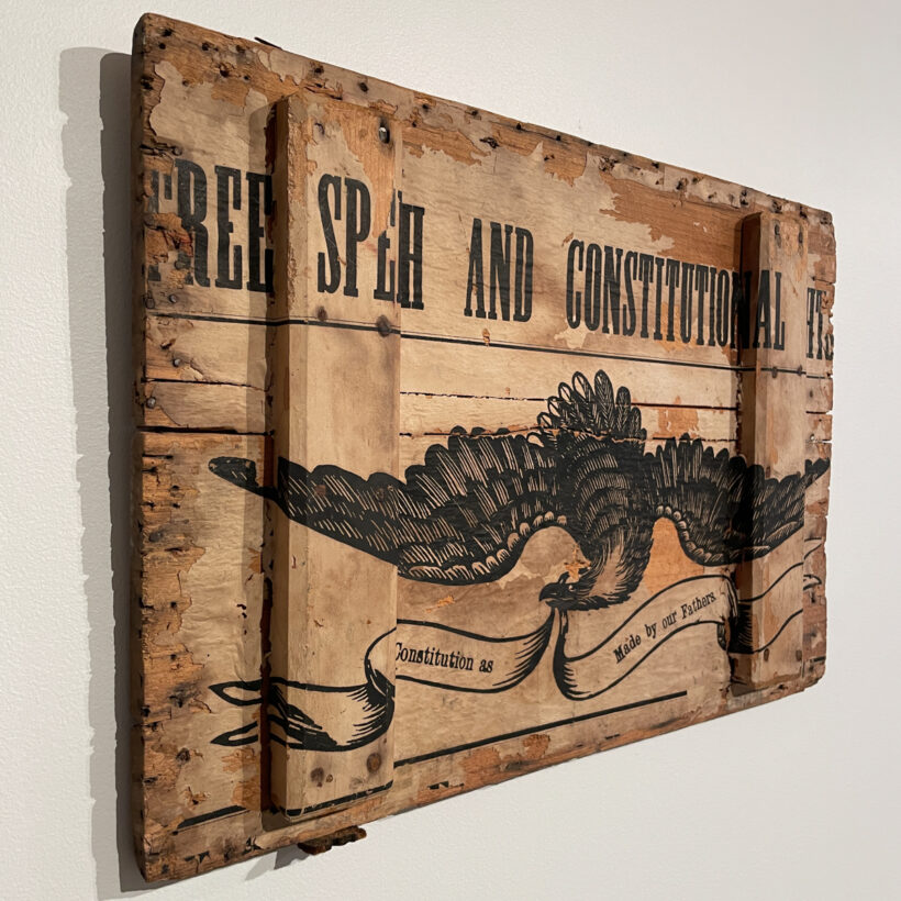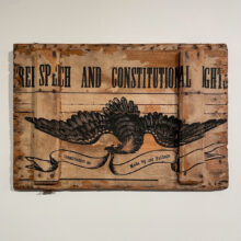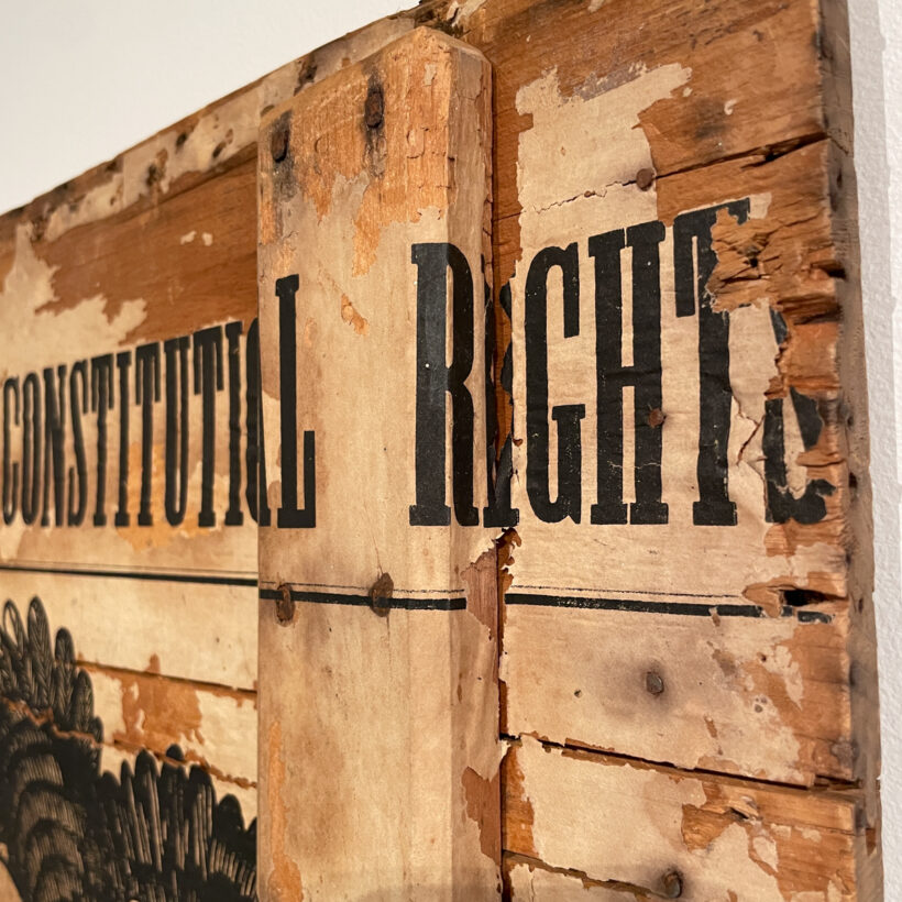 Civil War-era broadside-lined box lid emblazoned “Free Speech and Constitutional Rights” / attributed to the 1864 Lincoln-Johnson presidential campaign / as-found wooden trunk lid / ca. 1860s