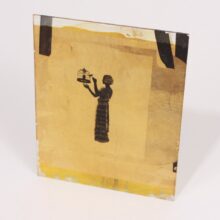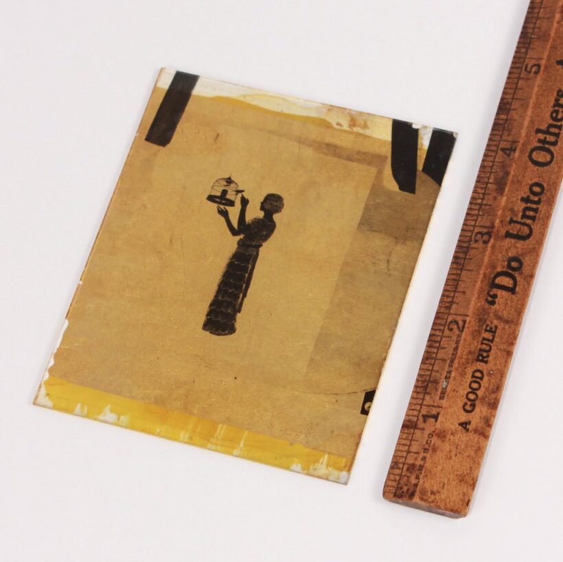Unusual antique hand-painted glass negative, c. 1920. I’ve never seen anything like it before. It appears to be a photographic negative of a backlit woman and caged bird, which was hand-painted and then backed with gold leaf, giving it a marvelous glimmering effect. The back was then varnished, to prevent flaking. The effect is luminous and surreal.