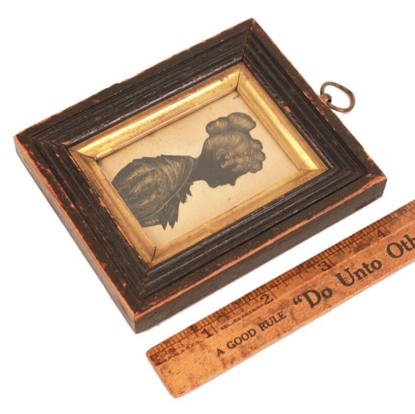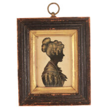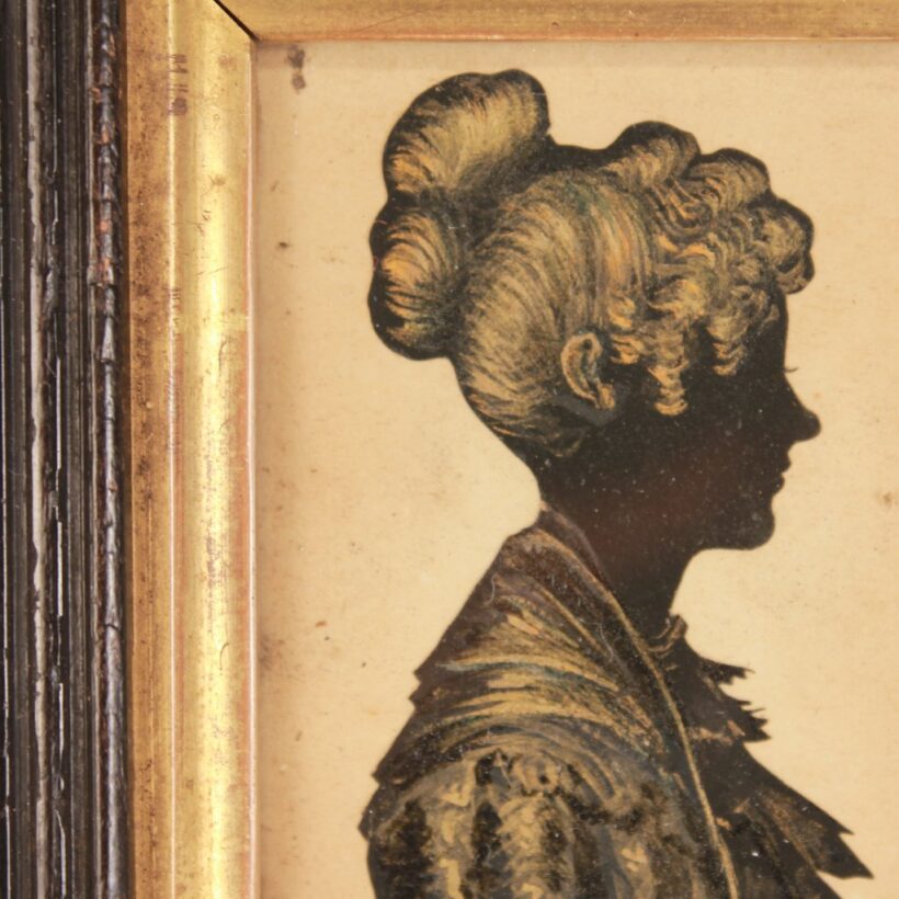 Fine mid-19th century silhouette of a young woman, c. 1840s. Exquisite details in gold chalk. Original period frame.