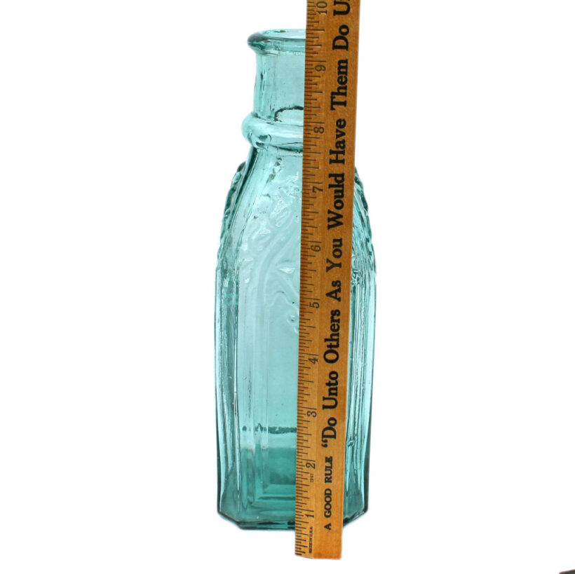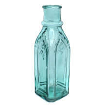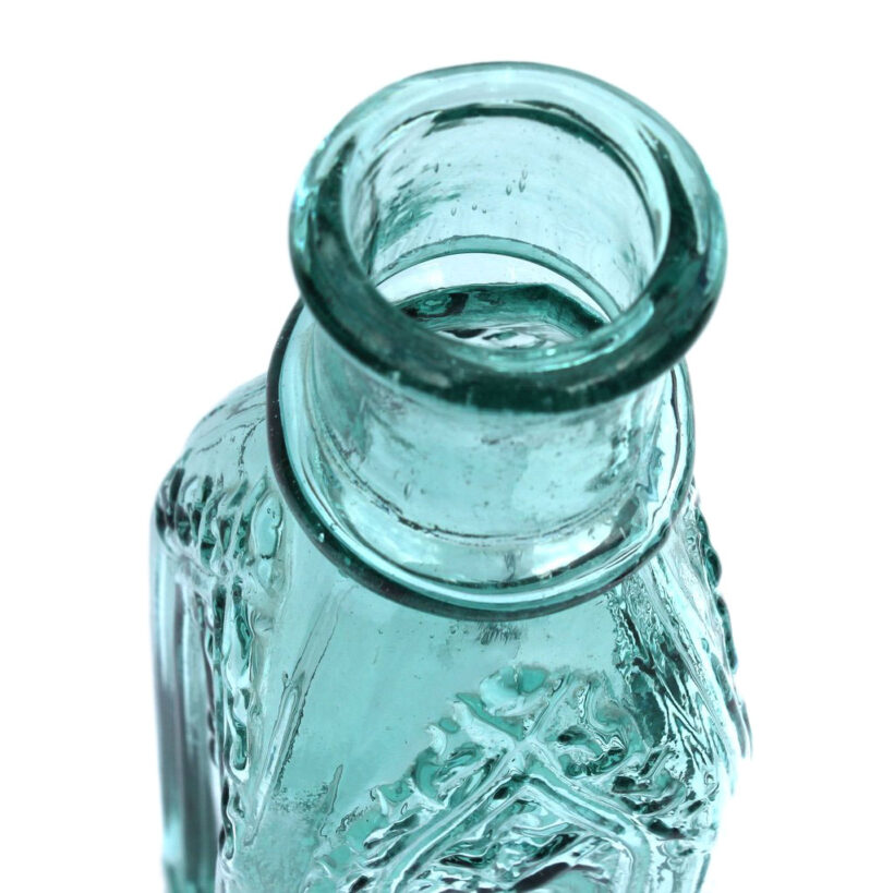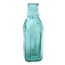 Antique square pickle bottle with embossed gothic design elements, c. 1860s. Rich aqua color. Cathedral panels on all sides. Outward rolled lip. Open bubble on base (original to manufacture) but otherwise smooth. A rare antique American bottle in a beautiful form and color.