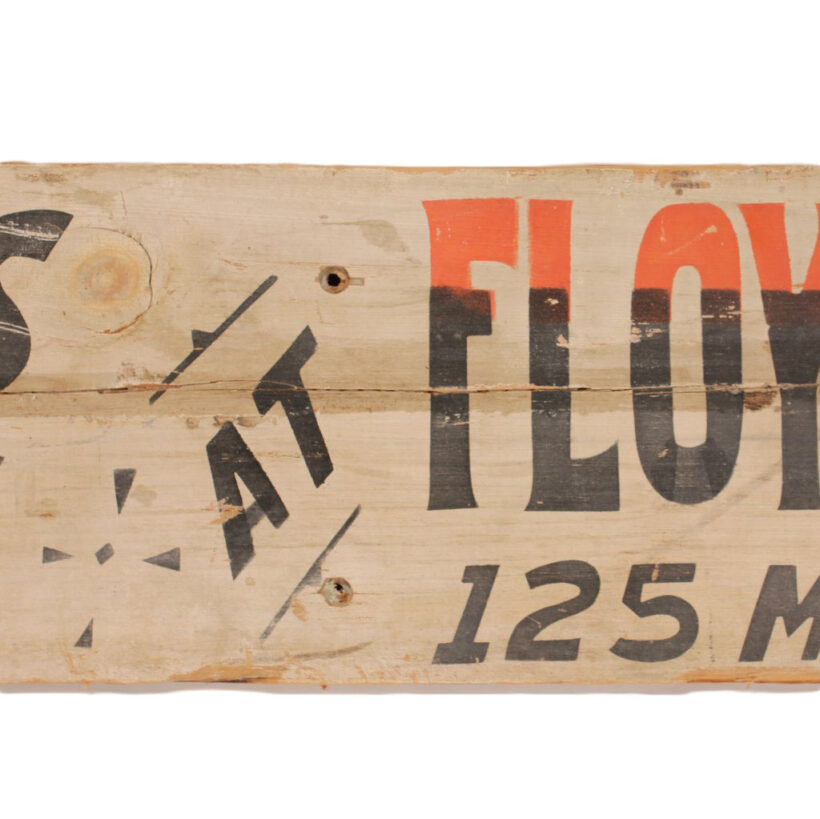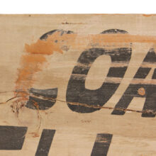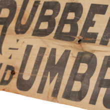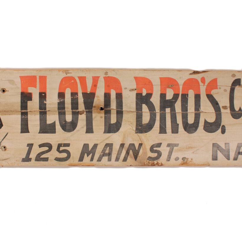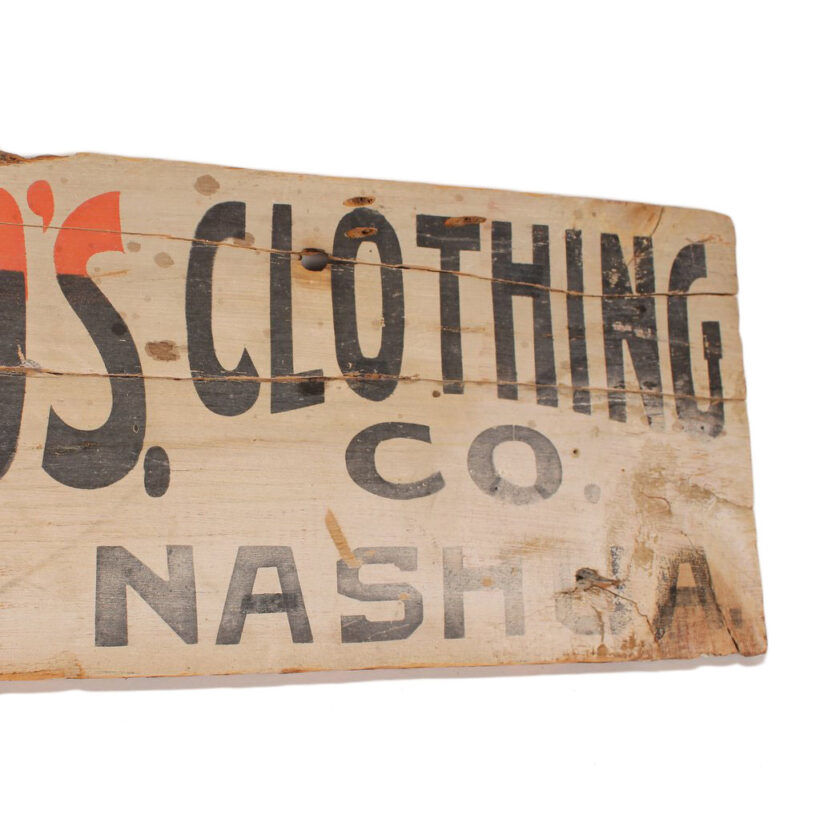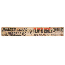 Antique painted wooden haberdasher’s sign, c. 1890s. The three and a half foot long sign has great hand-painted lettering and ornament with touches of orange color. Originating in Nashua, New Hampshire, it advertises “Rubber Coats and Umbrellas at Floyd Bros. Clothing Co. 125 Main Street Nashua.” The piece is in weathered condition with handsome patina from many years outdoors. A rare survivor.