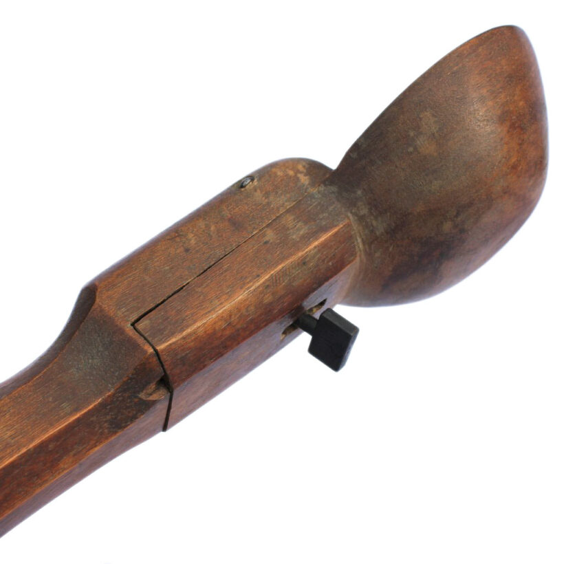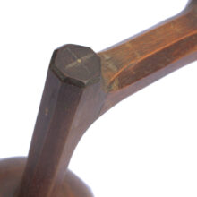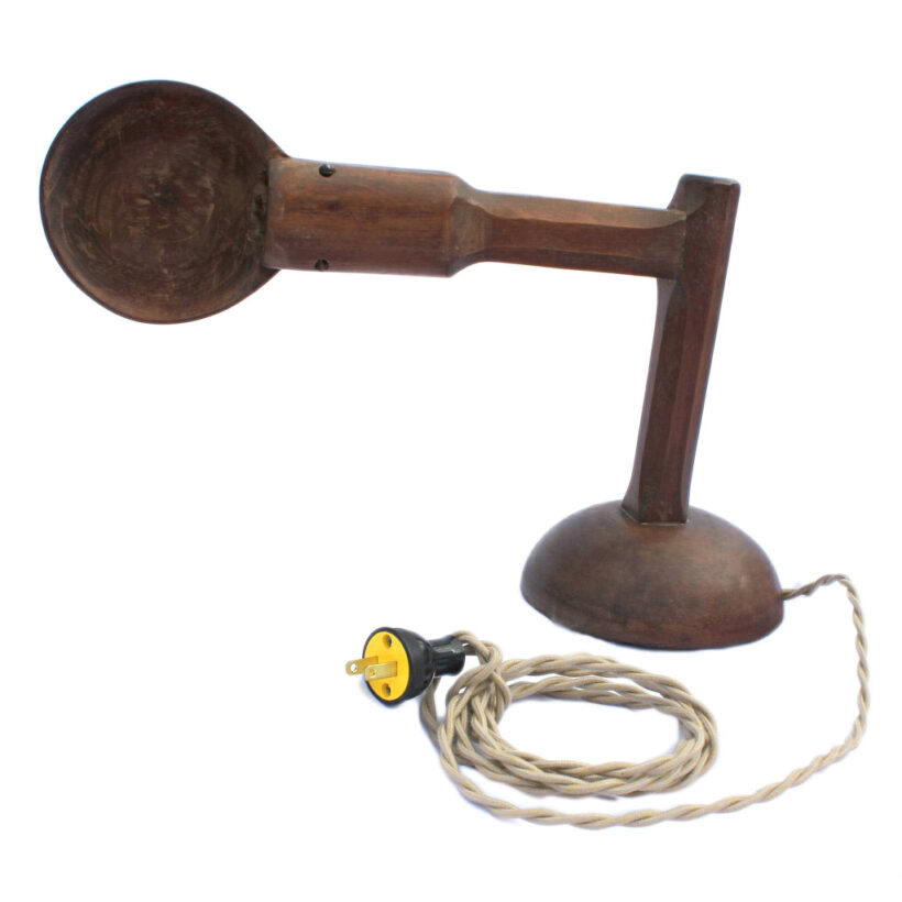The form of each lamp is angular, yet sinuous, with edges chamfered and smooth, the bases rounded. The lamps each face different directions, with hand-carved wooden shades fixed at right angles intended to face a wall. Alternatively, the pair could easily be mounted to a wall as sconces, with the shades directing light down or up, depending on preference. Each have been rewired with new toggle sockets and reproduction cloth-covered wire to match the original components.