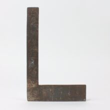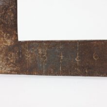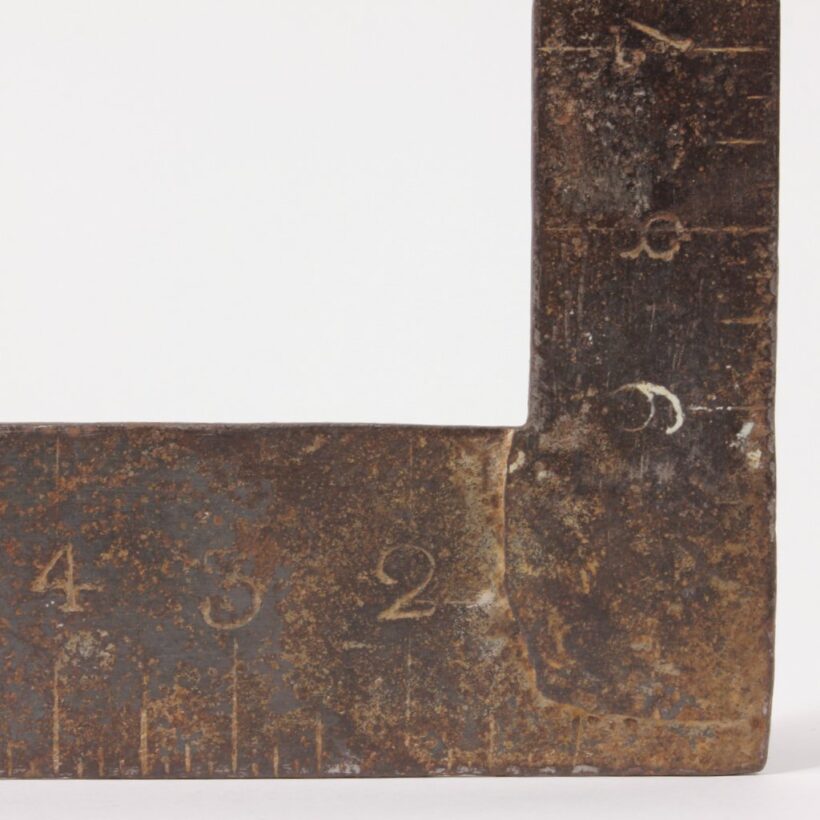 An early blacksmith-made iron carpenter’s square, c. late eighteenth or early nineteenth century. The earliest square of its kind I’ve seen, the iron tool was likely hand-forged by its user, with hand-hammered measure markings and numerals. A sculptural (and useful) object.