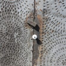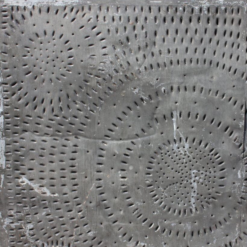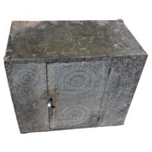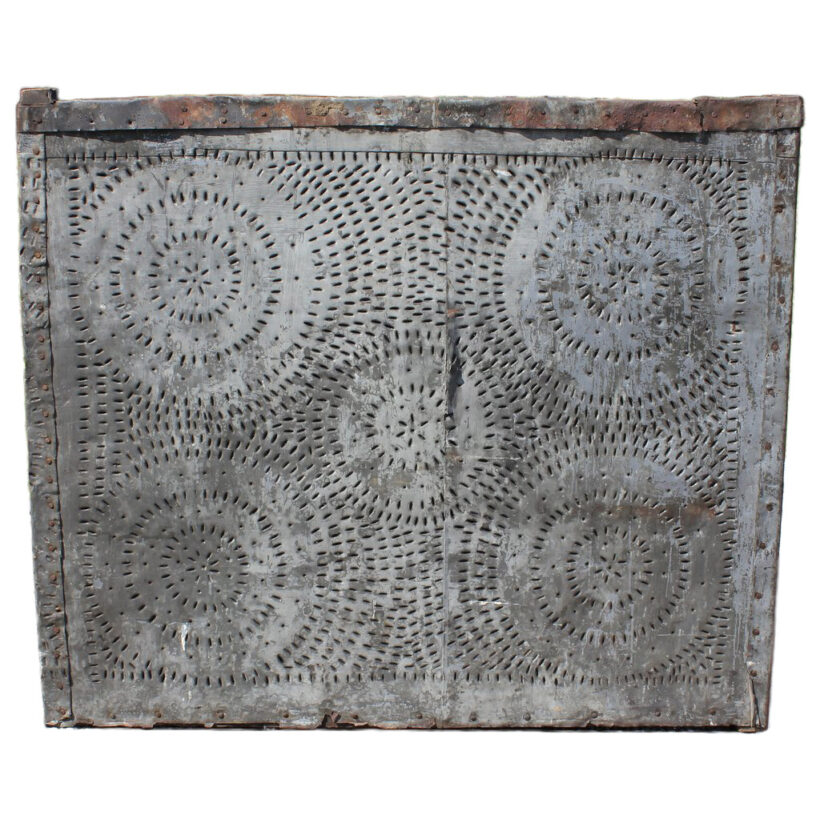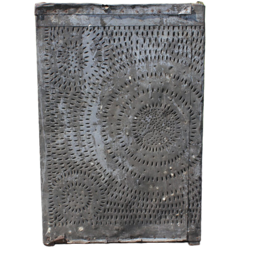 Antique pierced tin pie safe with interior wooden shelves, c. late 19th century. This primitive cabinet was designed to hang by rope or chains from a ceiling, protecting food (e.g. pies) from flies, farm animal critters, and enterprising family dogs. This pie safe is exceptional for its sculptural, almost modernist design. The tin is pierced in concentric circles, but rather than applied to the wood frame in the typically centered fashion, it is nailed on like wrapping paper, the pierced patterns taking on compelling asymmetrical compositions on each side. Lit from within by a lamp, the piece becomes an atmospheric illuminated sculpture, further underscoring its remarkably contemporary artistic presence.