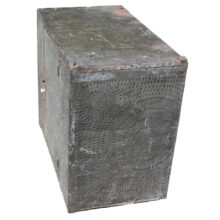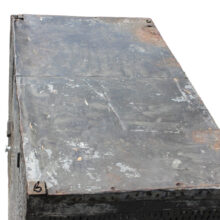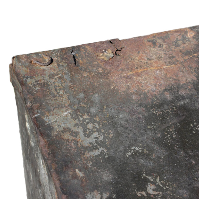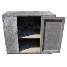 Condition-wise, the primitive piece shows its age and has a beautiful antique patina. The tin is worn and bent in places, with a few small weak spots due to corrosion from many years tucked away in a farm outbuilding. Inside the piece, I had my carpenter replace missing shelves with sturdy antique barn boards, which can support significant weight.