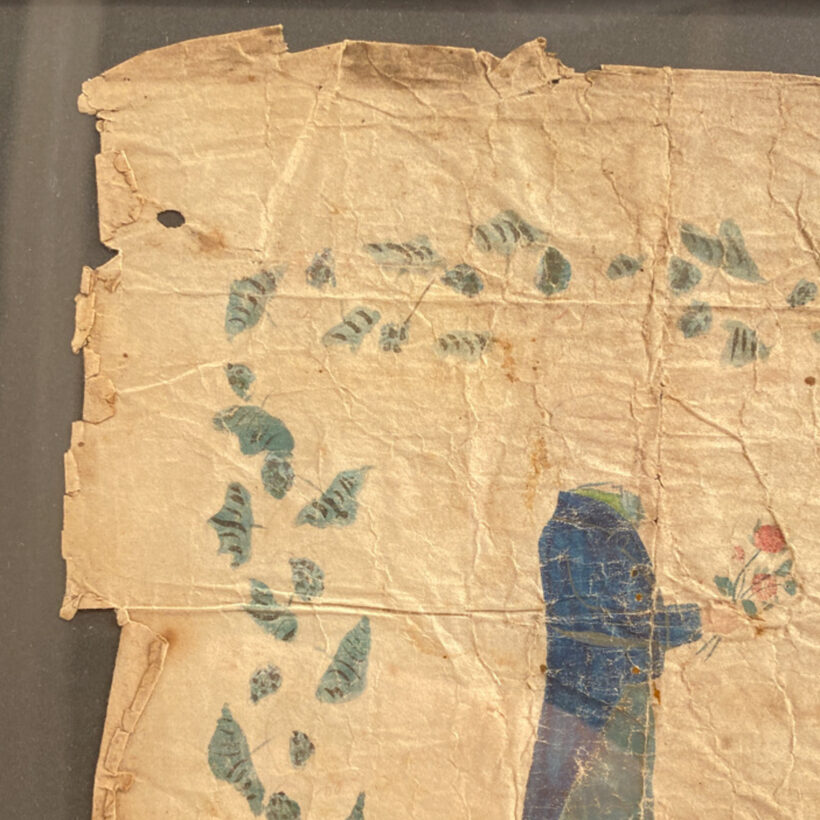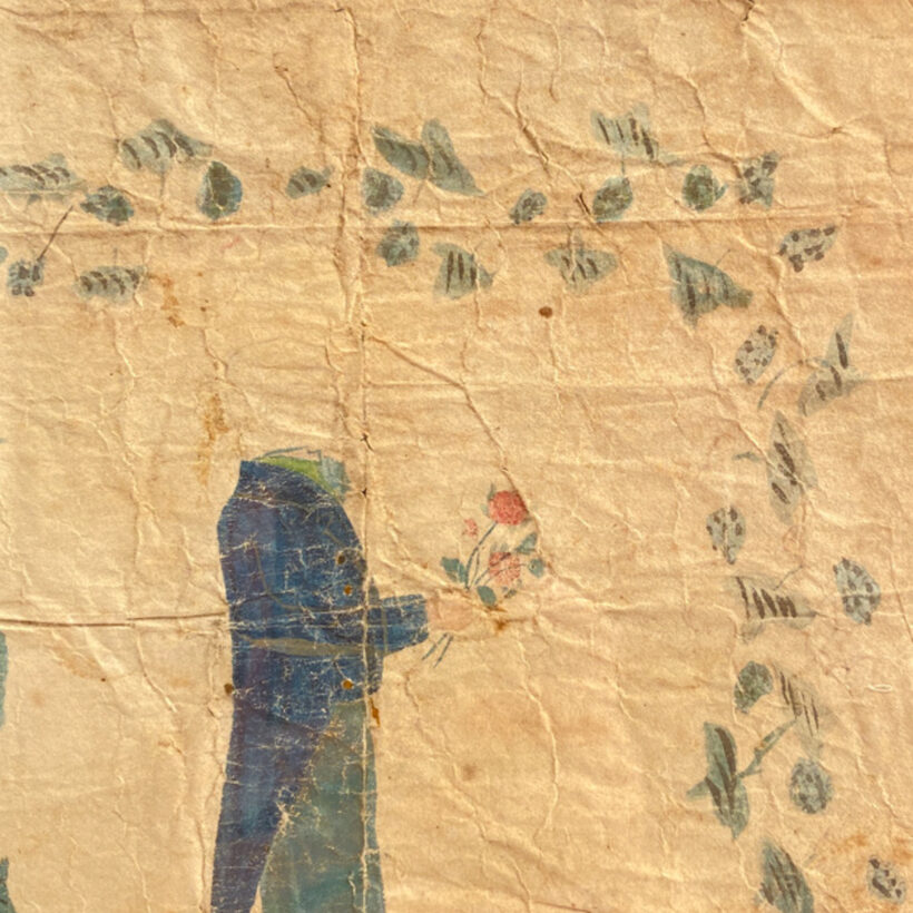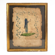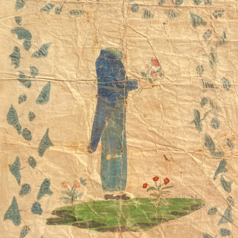 Early American folk art watercolor of a gentleman carrying a bouquet of flowers. Unfinished, the subject lacks his head, as if the artist was waiting to fill in the visage of an imagined suitor. An unlikely survivor, the piece is beautifully distressed, with fold marks and torn edges. A charming naive watercolor with unintentional poetic dimensions.