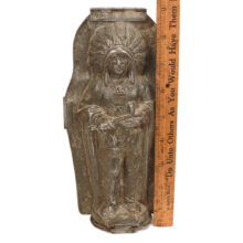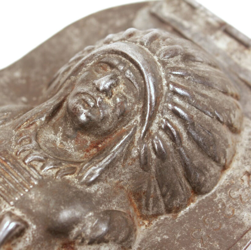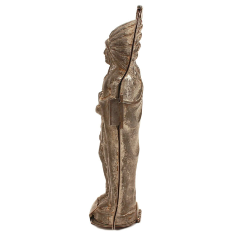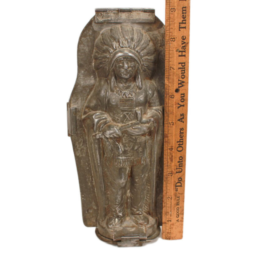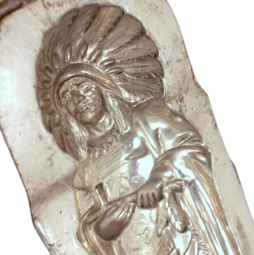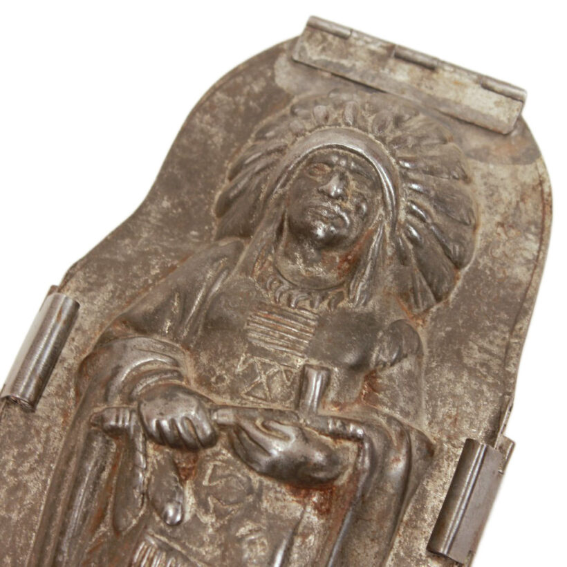 Rare antique chocolate mold in the form an American Indian chief by German maker Anton Reiche of Dresden, c. late 19th century. Extraordinarily detailed down to the feathers in the headdress and details of the pipe, this iconic Indian chocolate mold form no doubt held appeal for both American and European audiences alike. The mold is in an excellent state of preservation, with a gleaming nickel interior, and is original and complete. A rare piece for the Reiche chocolate mold collector and a remarkable object capturing the American ideal designed for consumption both here and abroad.