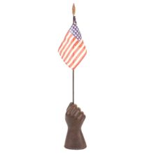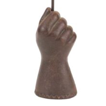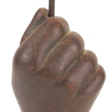Antique cast iron fist, c. mid-19th century. The heavy clenched hand, which is self standing, has a hole in the top which either held a chain as part of self-closing gate weight device or was meant as a flag holder, which is how I came across it (the antique silk parade flag pictured is included). Cast about the time of the American Civil War, the iron determination apparent in this forceful hand may have been forged in a fire stoked by ideals, but it is amputated, mindless, and cold outside the foundry. The fist’s iron grip holds a brittle stick with tattered flag, which it raises high only with effort as we create openings in walls, but drops again when left to its own dumb weight, bound by chains meant to shut gates and close minds.