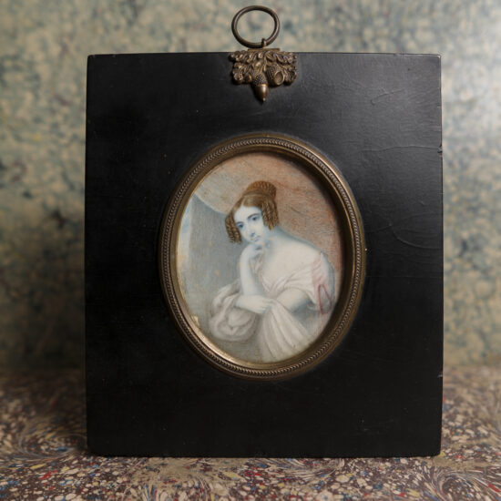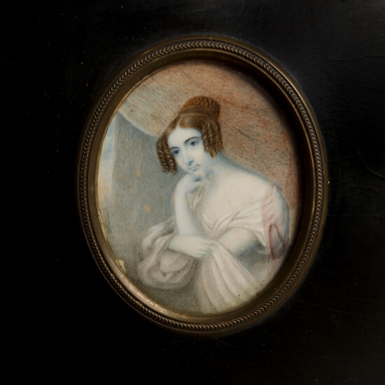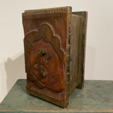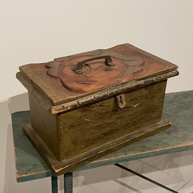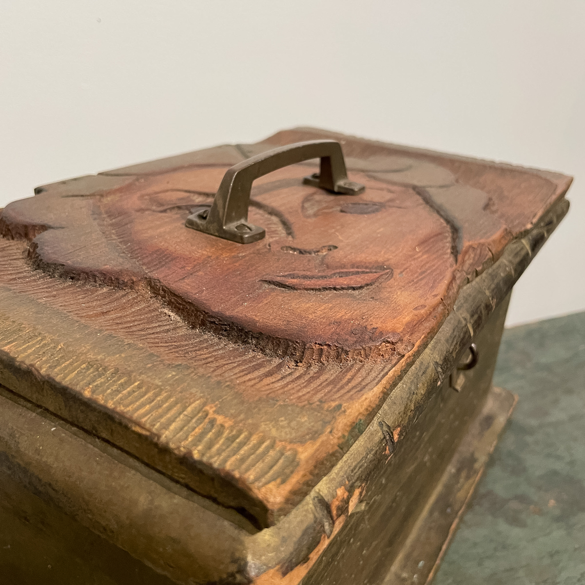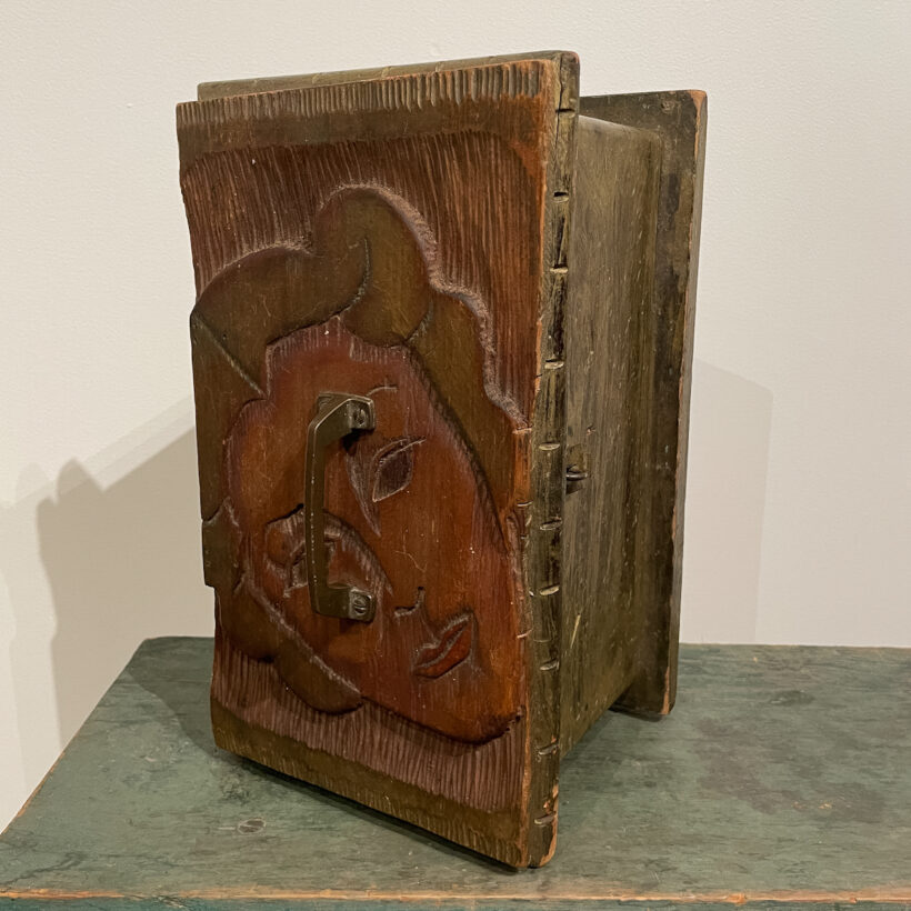A curious box with lid made from a hand-carved relief portrait of a woman, likely originally a handmade printer’s block for a large poster. An evocative piece of make-do functional art.