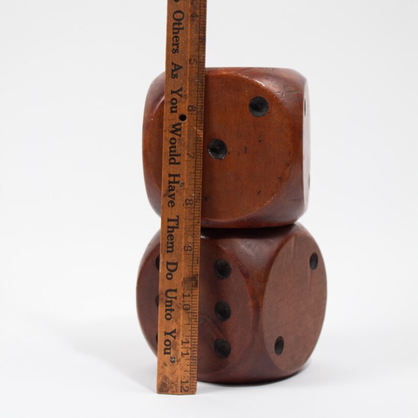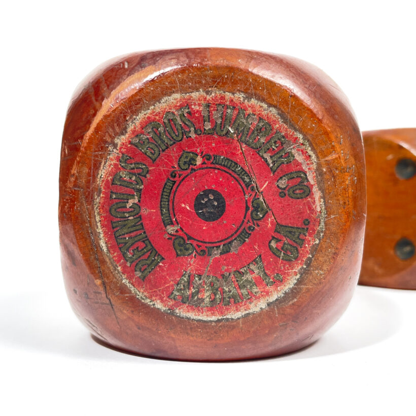 Wonderful oversized carved wooden dice advertising a lumber company. Apparently hewn from chestnut, the pair have a handsome depth to the finish and a well-rolled patina. Polychrome labels with gold lettering advertise the product of the Reynolds Brothers Lumber Co. of Albany, GA.