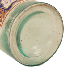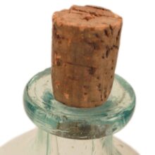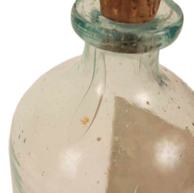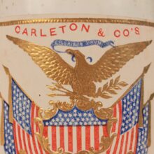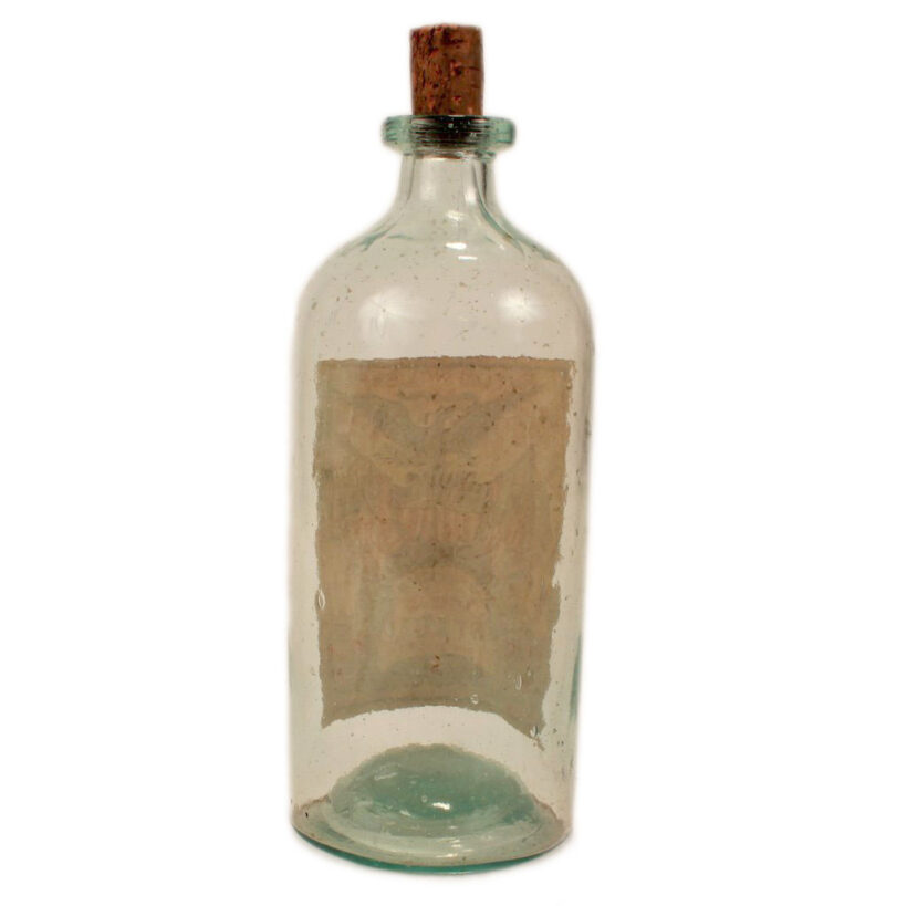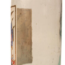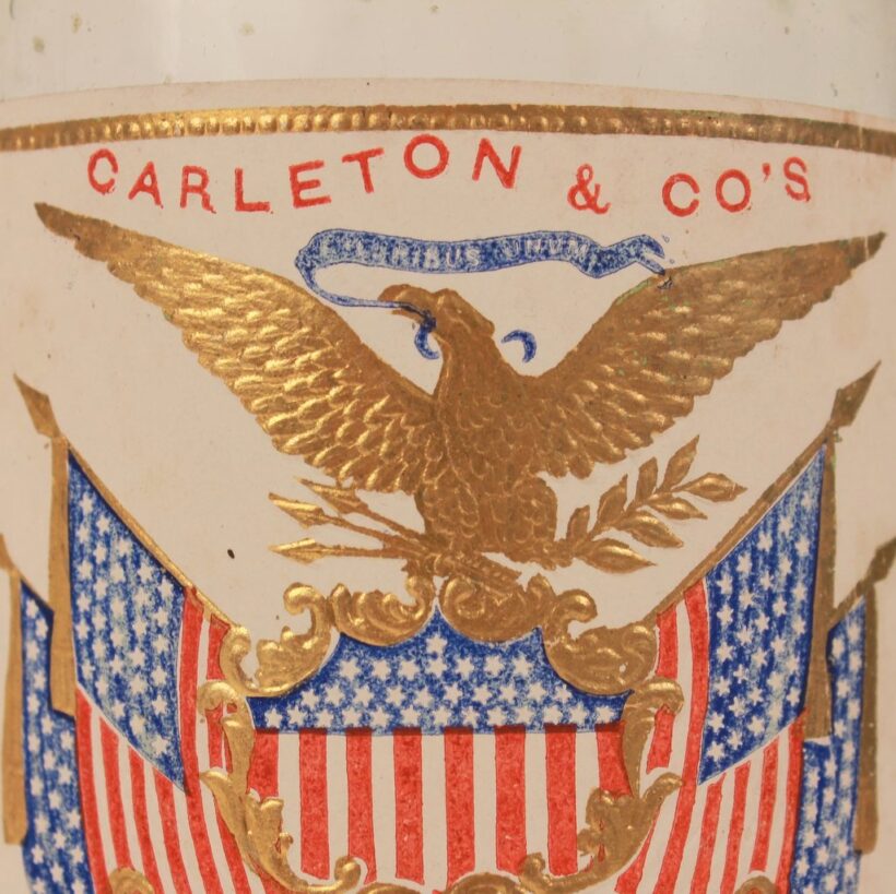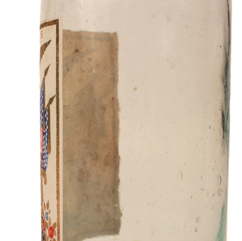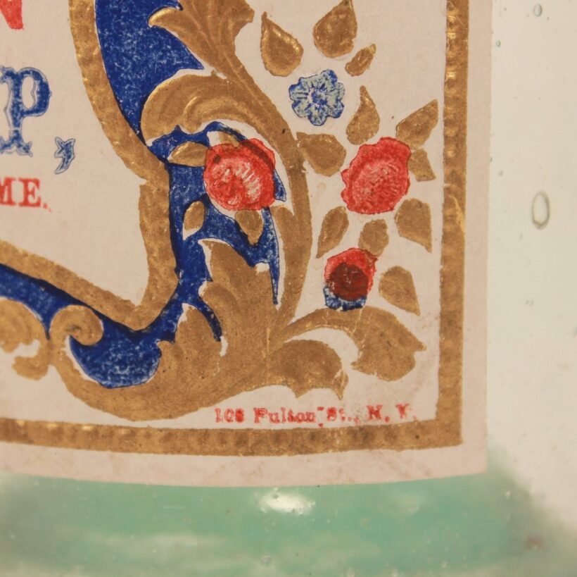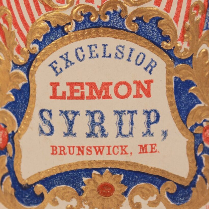 Antique “Excelsior Lemon Syrup” bottle with colorful embossed patriotic paper label indicating Brunswick, Maine origin, c. 1870s. Extraordinary time-warp condition — found in a Maine farmhouse, the 150 year old bottle must have been tucked away forgotten in a pantry since the late 19th century. The colors and gilding on its elaborate paper label are as bright and crisp as the day they were printed. The bottle itself is a beautiful pale aqua color and full of bubbles. A remarkable survivor and a rare advertising bottle.