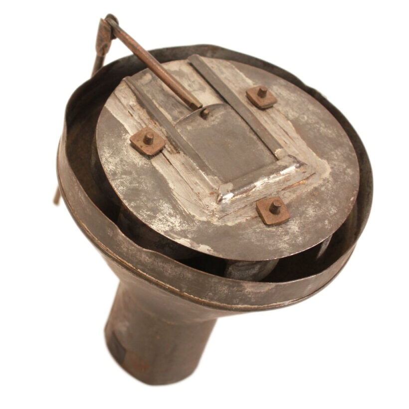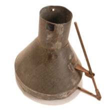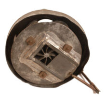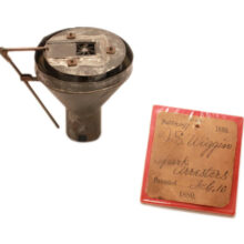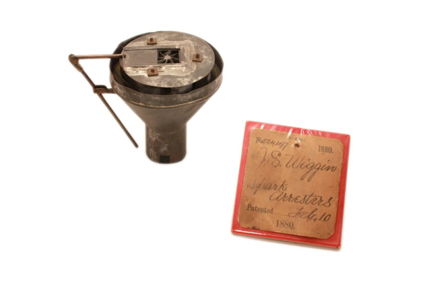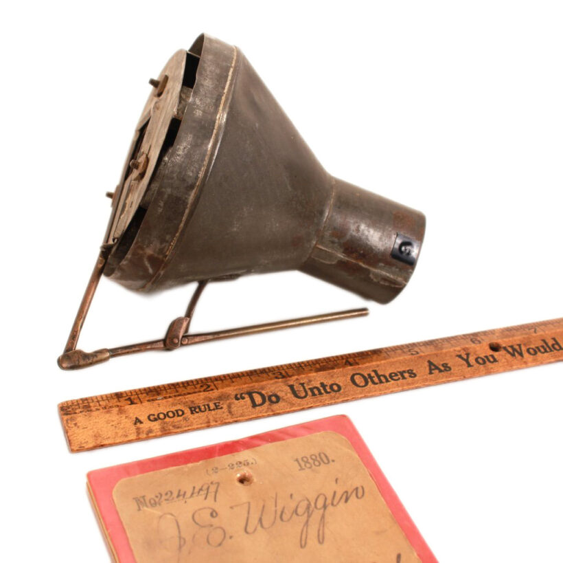 This unusual patent model was created to demonstrate an innovative design to the locomotive smoke stack. John Wiggin of Houston, Texas, filed his application for his “Spark Arrester” on December 19, 1879, and was granted Patent No. 224,497 on February 10, 1880. According to Wiggin, his invention would create a “partial vacuum” which prevented “not only the emitting of black smoke, but will also effectively reduce the larger sparks to a degree from which no danger may be apprehended.” The patent model includes its original tag, which was backed in paper board and plastic to preserve it. A rare patent model for the railroad collector, but also a compelling work of industrial sculpture.