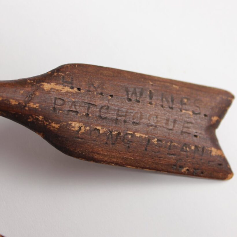Cupid hit the mark with this unusual love-struck whimsy, hand-carved from a single piece of wood. The carving is signed “H.M. Wines, Patchoque, Long Island.”