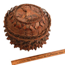 Maine Native American Passamaquoddy porcupine basket with removable top. The date May 9, 1876 and the name “C.L. Stoddard” are written in pencil on the bottom. Beautiful and unusual form. A rare survivor.