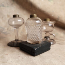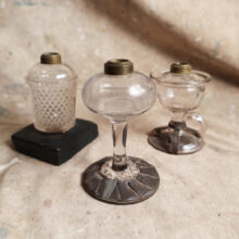 Group of three nineteenth-century glass oil lamps with wonderful make-do repairs. The one with a handle has a particularly masterful tinsmith repair: a metal superstructure surrounds the glass base and fastens securely to the broken edges. The other two reveal household ingenuity and thrift: the teardrop lamp has a crimped metal and plaster replacement base, while the honeycombed pressed glass lamp has picked up one cut from a painted block of wood. In each case, the repairer devised a design intervention that would make a future topple and break far less likely.