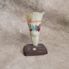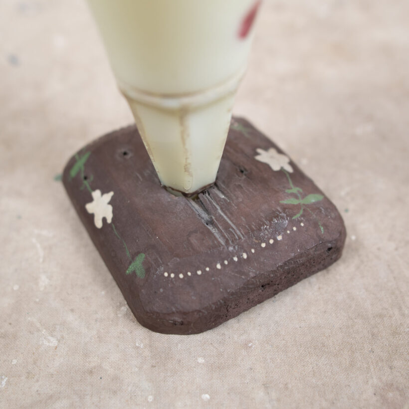 Victorian souvenir vase from Montgomery, Minnesota with charming make-do repaired base of wood with naive painted floral-decoration.