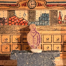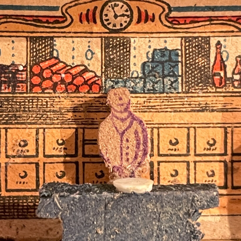 At just over two inches long, this tiniest of general stores is furnished with wood counters and staffed by a miniature shopkeeper.