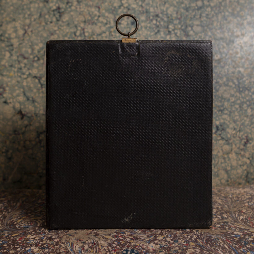 Original ebonised frame with inset brass oval and acorn hanging loop.