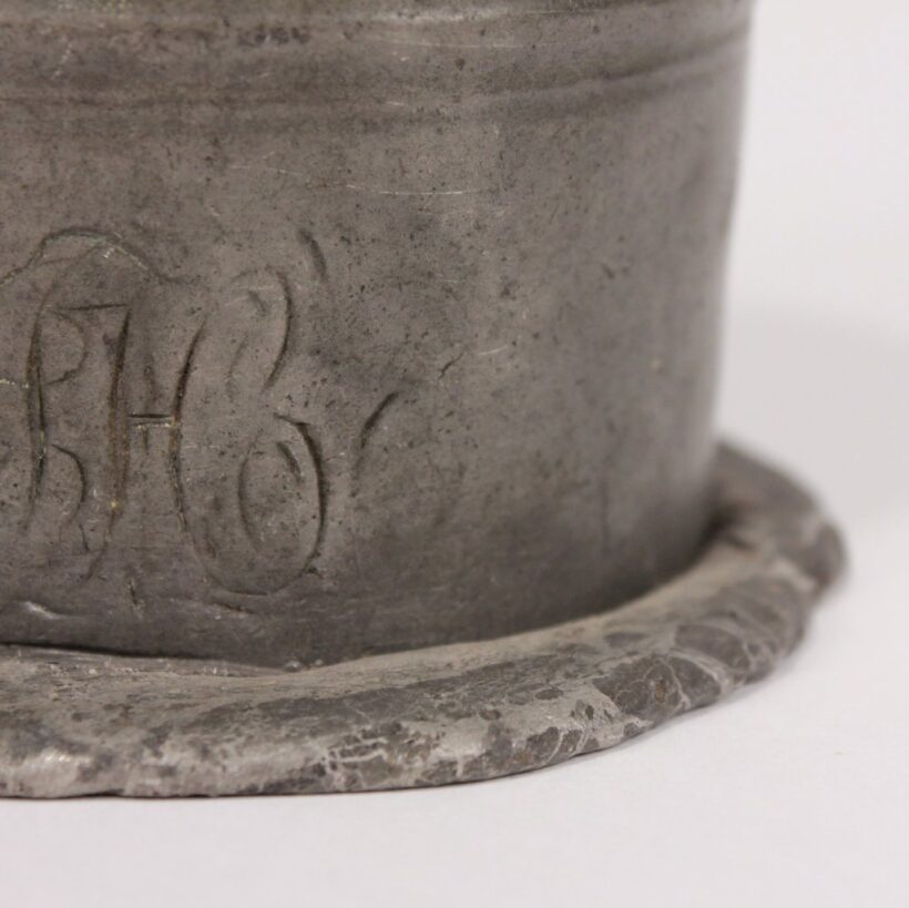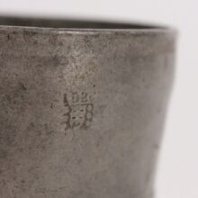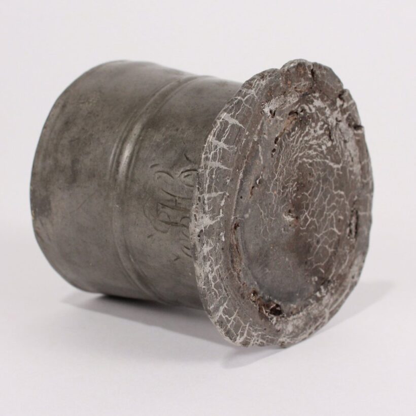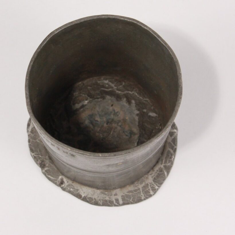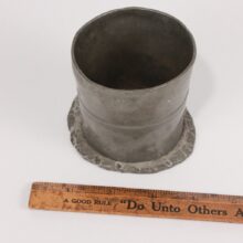 Antique pewter 1/2 pint beaker, dated 1826. A victim of an absent-minded cook, the cup was likely forgotten on a hot stovetop two hundred years ago and began to melt, forming a pool at its base. Though long solidified, the less-than-half-pint beaker still seems to sink into itself, like melting ice cream.