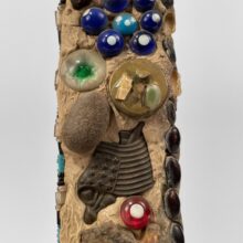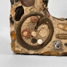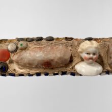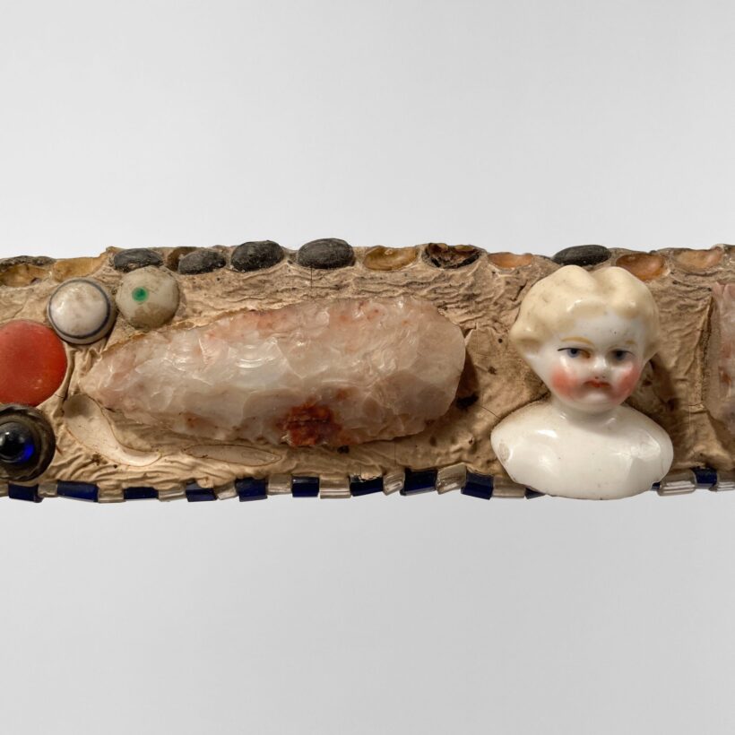 Exceptional memoryware frame, c. third quarter nineteenth century. Memory frames are uncommon to find, and this one is particularly satisfying with its surreal arrangement of random objects. The wooden frame is inset with all manner of the curious and commonplace, from early Native American arrowheads and antique jewelry fragments to beans and walnut shells, arranged in semi-symmetrical design and centered on a painted china doll’s head. These seemingly inconsequential things may have been consequential to their one-time owner — such memory assemblages brought together bits and pieces meaningful to their makers, with some examples created to memorialize the dead. An excellent example of this American folk art tradition.