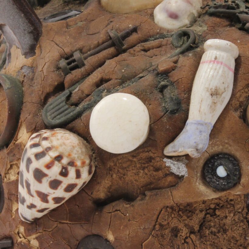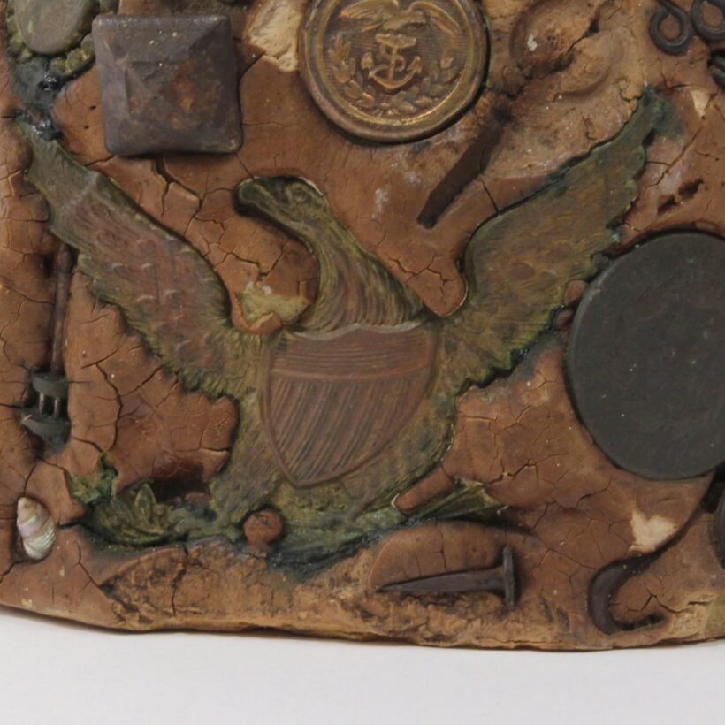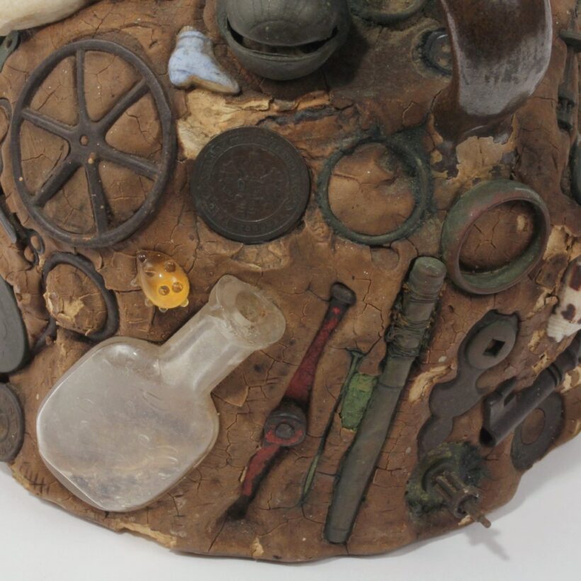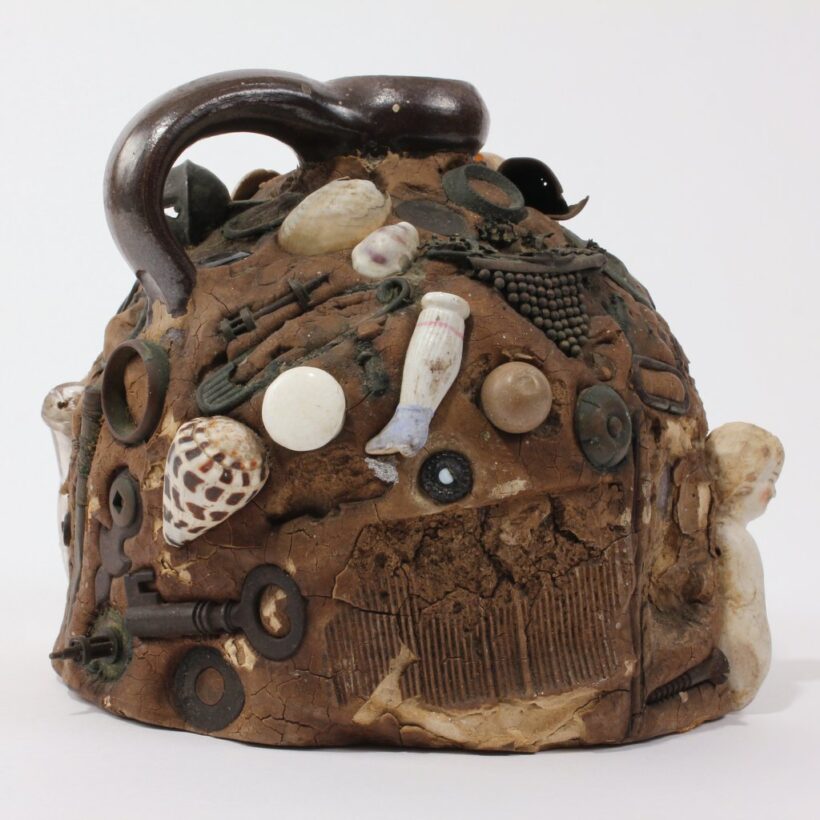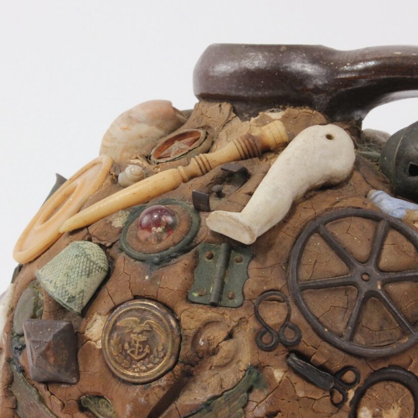 Exceptional memoryware jug, c. third quarter nineteenth century. The jug holds fast innumerable curious objects, featuring jewelry, early coins, bottles, buckles, buttons, toy fragments, and militaria including a pre-Civil War U.S. Army brass eagle cap insignia dating to the 1830s or 1840s. These seemingly inconsequential things may have been consequential to their one-time owner — such memory assemblages brought together bits and pieces meaningful to their makers, with some examples created to memorialize the dead. An evocative and rich example of this American folk art tradition.