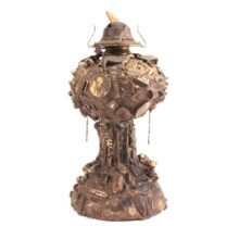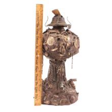 Antique folk art “memory” oil lamp, c. 1930s. Memory objects—most commonly taking the form of jugs—were popular in the late 19th and early 20th centuries to commemorate past experiences by bringing together accumulations of little tchotchkes associated with certain memories.