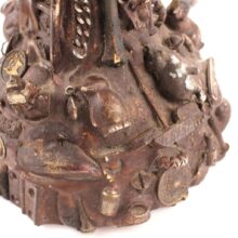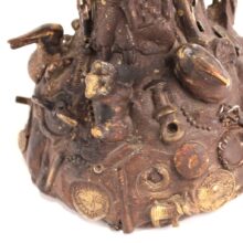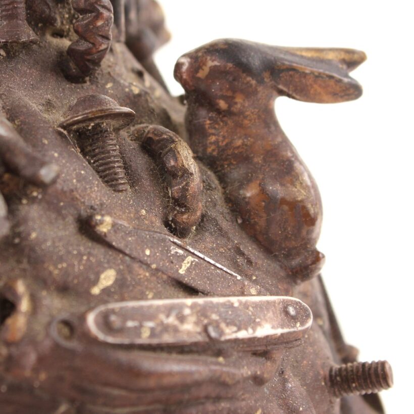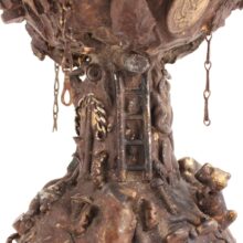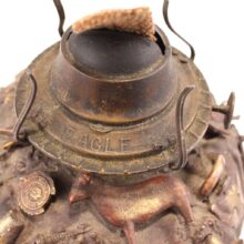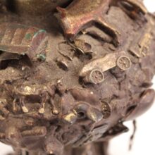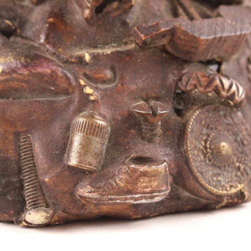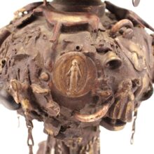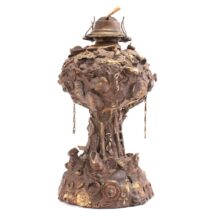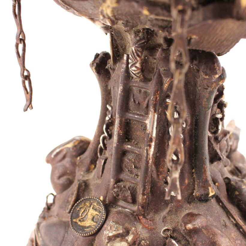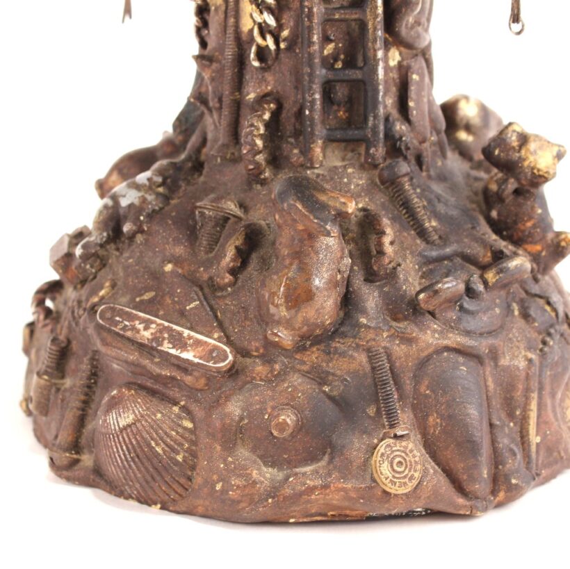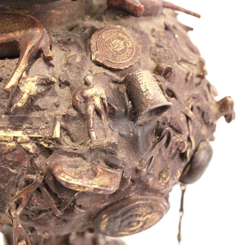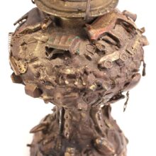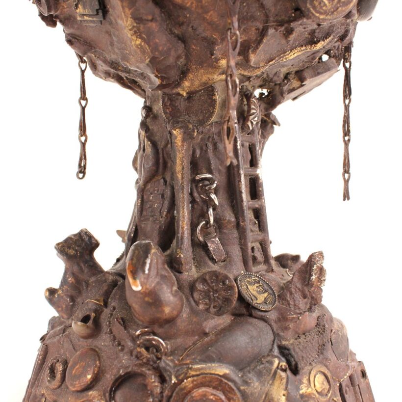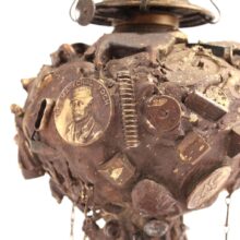 The oil lamp here was likely overcome by such small significant objects in the 1930s, when its owner applied an unusual number and variety of items—some layered on top of one another—to its glass surface. Each object perhaps had some meaning to the memory lamp’s creator, and combined they take on poetic, even monumental proportions despite their scale and humble origins. Human figures, coins, knives, toy animals, chains, shells, jewelry, pottery shards, buttons—each viewing brings new objects to light, and further complicates the relationships and interactions between the miscellaneous bric-a-brac. Applied in plaster to the lamp, the composition was painted with gold-brown radiator paint, recalling bronze. The effect further likens the assemblage to the swirling, chaotic mass of figures in Rodin’s “The Gates of Hell.”