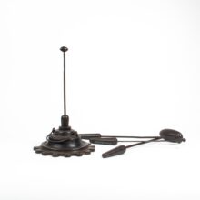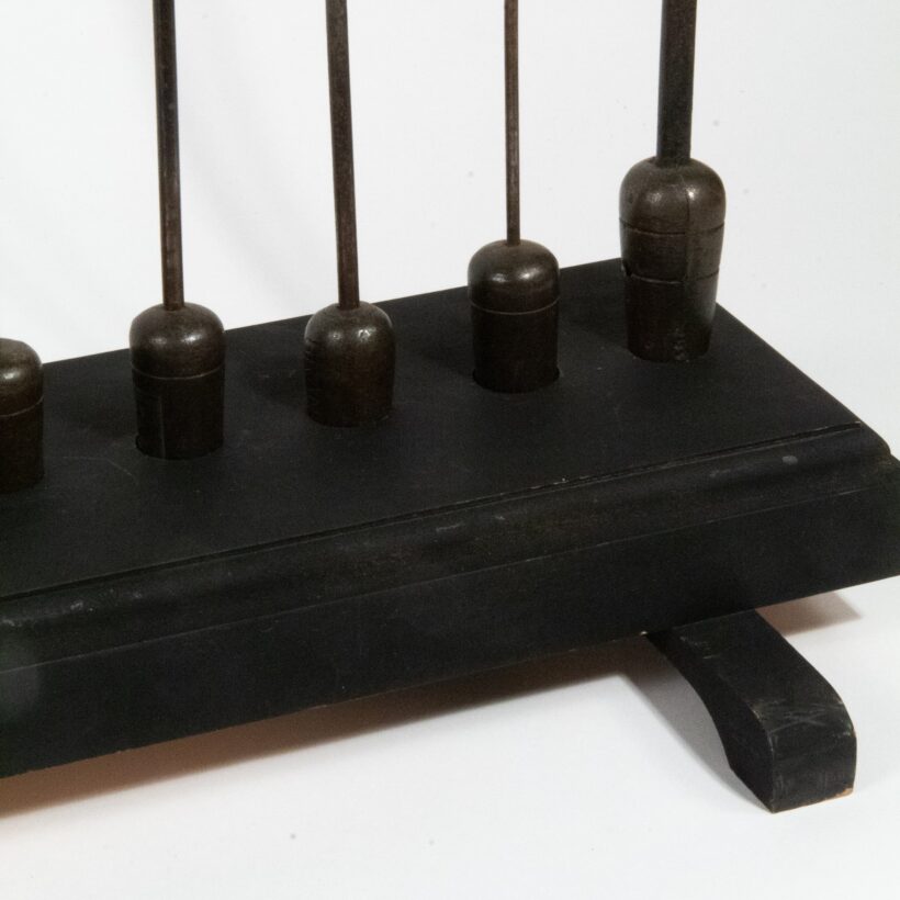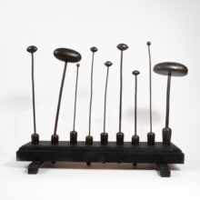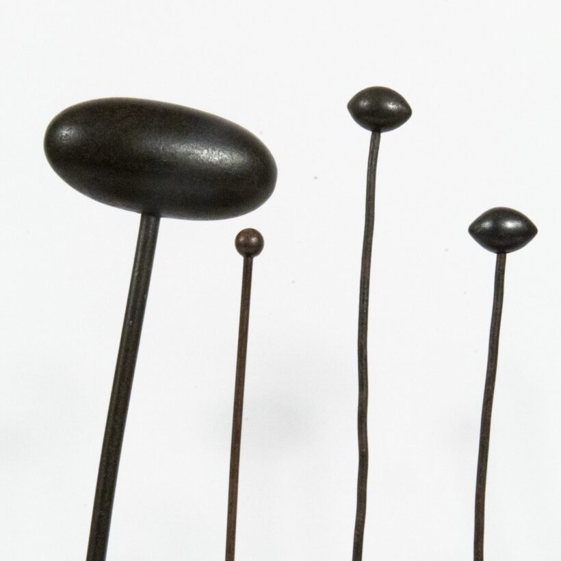 Rare set of French millinery irons used in the design and production of ladies hats. In use, they would be individually placed inside the circular iron stand which would conduct heat from a stove. Now with a contemporary custom wooden stand lining them up in a row, the irons are striking sculptural objects, each with an organic quality evoking the stems of flowers.