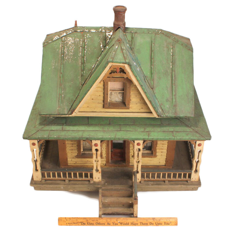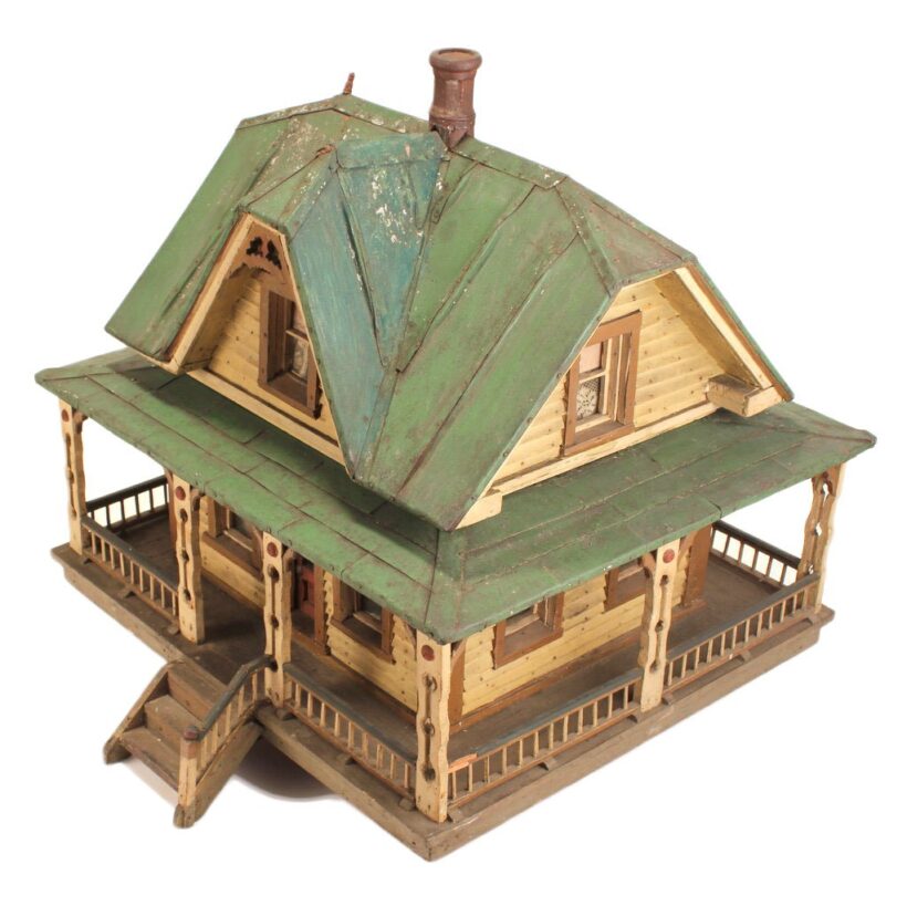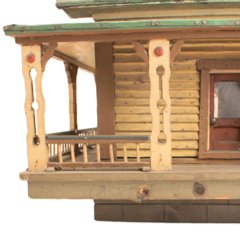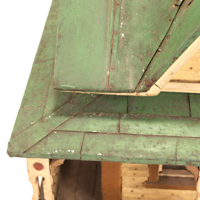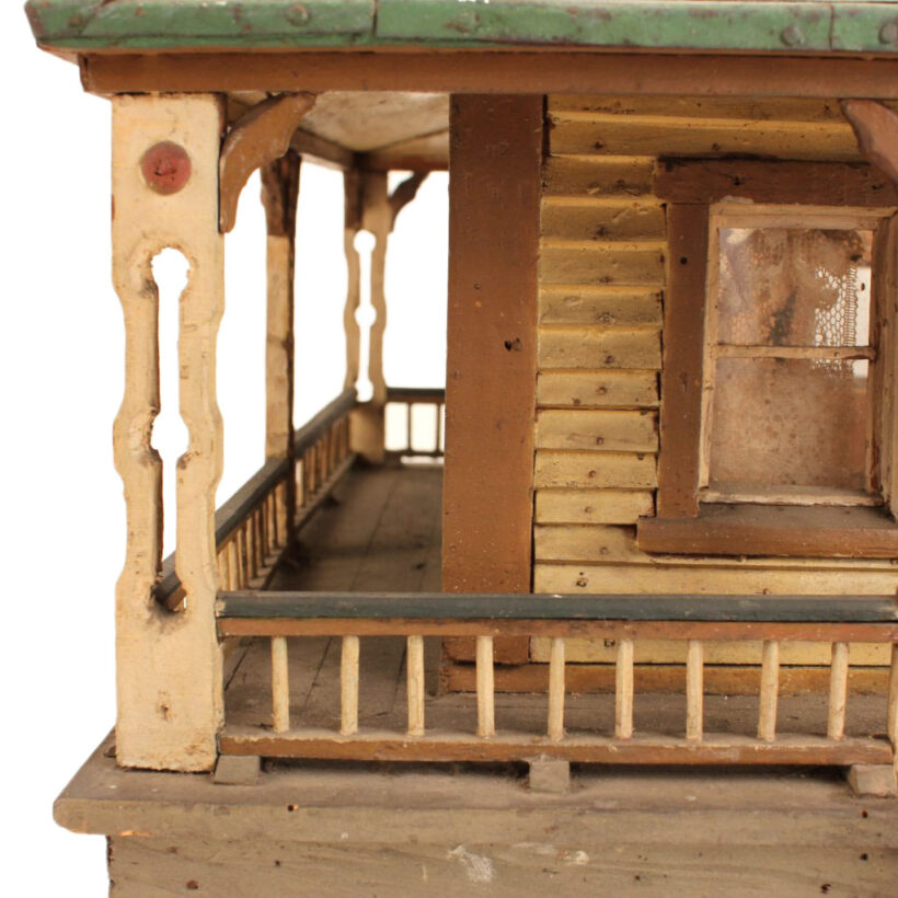 Miniature folk art house, North Shore Massachusetts, c. 1910s. At only 19 inches tall and 18 inches wide, this is by far the most detailed and painstaking homemade architectural model I’ve found. The gabled home has wooden clapboard siding — each clapboard individually applied with tiny nails — and a painted tin roof, also realistically rendered. However, it’s the fine and thoughtful architectural details that made this miniature dwelling exceptional. Take the front door alone: The rails and mullions are precisely chamfered, and while the top panel is glazed, the lower panel is decorated with a raised diamond motif. Likewise, the pierced and chamfered posts on the porch were crafted with exquisite care, as were the decorative brackets and other fretwork. The glass windows of the house are backed with paper and lace curtains, concealing an empty interior which was possibly electrified at one time. One of the cut pieces of paper has the year 1913 printed on it and provides a clue to the little house’s age. The miniature home was abandoned in an attic for nearly a century, and while it gathered dust it remained remarkably intact, with little wear besides some chippy paint. Almost certainly designed after an existing structure — which could very well be gone itself — this miniature house is not only a remarkable piece of a folk art, but also a charming example of vernacular architectural design.