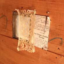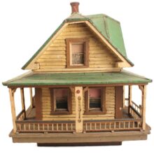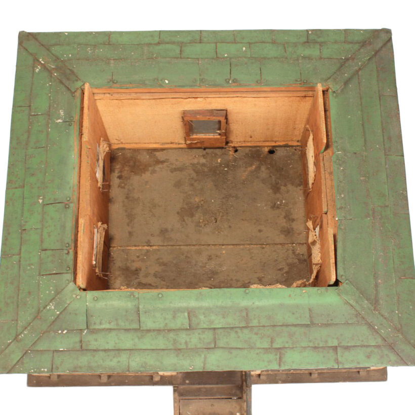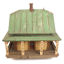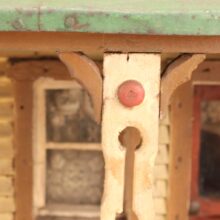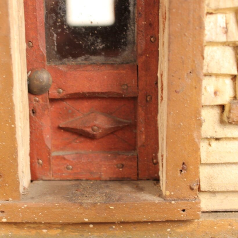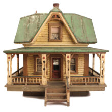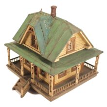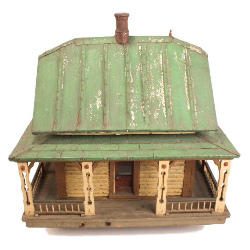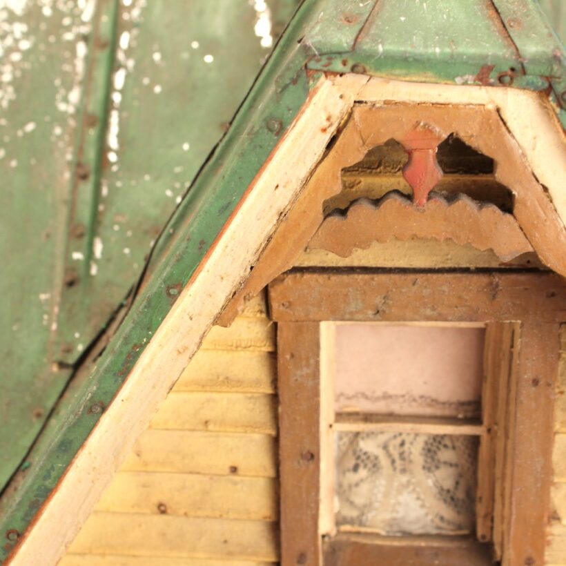 Miniature folk art house, North Shore Massachusetts, c. 1910s. At only 19 inches tall and 18 inches wide, this is by far the most detailed and painstaking homemade architectural model I’ve found. The gabled home has wooden clapboard siding — each clapboard individually applied with tiny nails — and a painted tin roof, also realistically rendered. However, it’s the fine and thoughtful architectural details that made this miniature dwelling exceptional. Take the front door alone: The rails and mullions are precisely chamfered, and while the top panel is glazed, the lower panel is decorated with a raised diamond motif. Likewise, the pierced and chamfered posts on the porch were crafted with exquisite care, as were the decorative brackets and other fretwork. The glass windows of the house are backed with paper and lace curtains, concealing an empty interior which was possibly electrified at one time. One of the cut pieces of paper has the year 1913 printed on it and provides a clue to the little house’s age. The miniature home was abandoned in an attic for nearly a century, and while it gathered dust it remained remarkably intact, with little wear besides some chippy paint. Almost certainly designed after an existing structure — which could very well be gone itself — this miniature house is not only a remarkable piece of a folk art, but also a charming example of vernacular architectural design.