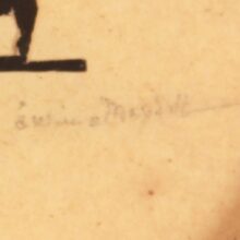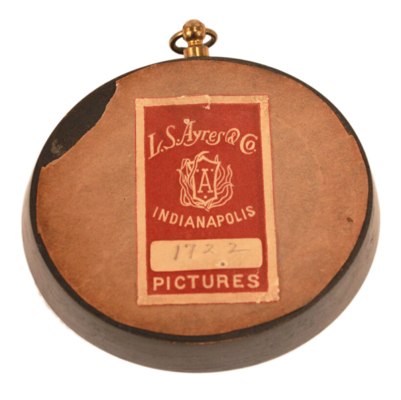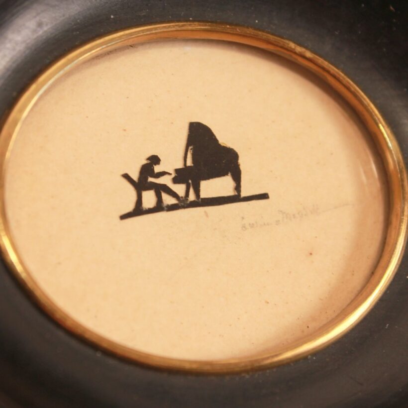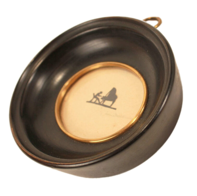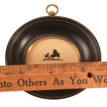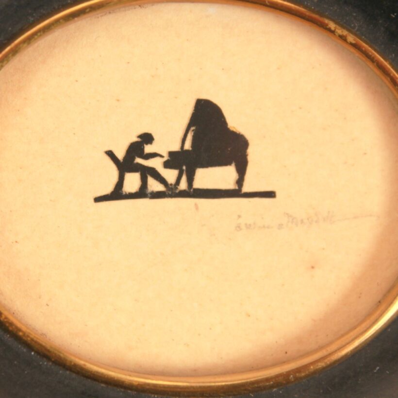 Remarkable miniature scissor-cut silhouette of a pianist, c. early 20th century. No doubt, the artist was a maestro of the craft: the tiny figure of the piano player is no more than 3/4 of an inch wide and 1/3 of an inch tall, hardly larger than a clef on a printed sheet of music. The piece is signed, but the signature is difficult to make out. The silhouette is framed in an oval molding with a deep cove, effectively drawing in the eye to the minuscule musician. Gallery label on the reverse reads “L.S. Ayres & Co. Indianapolis.”
