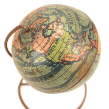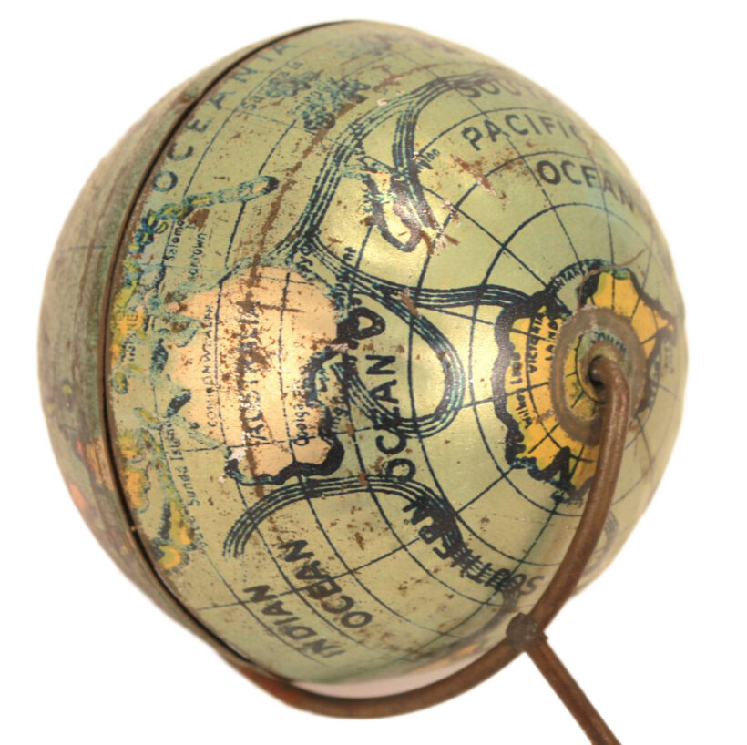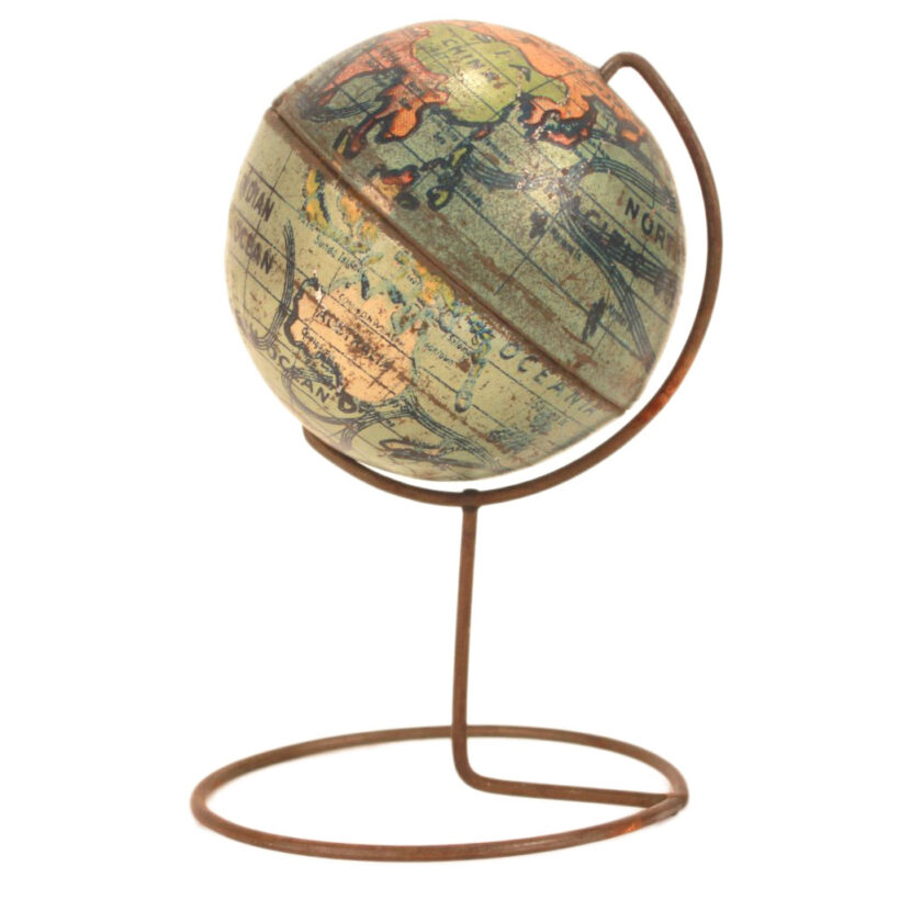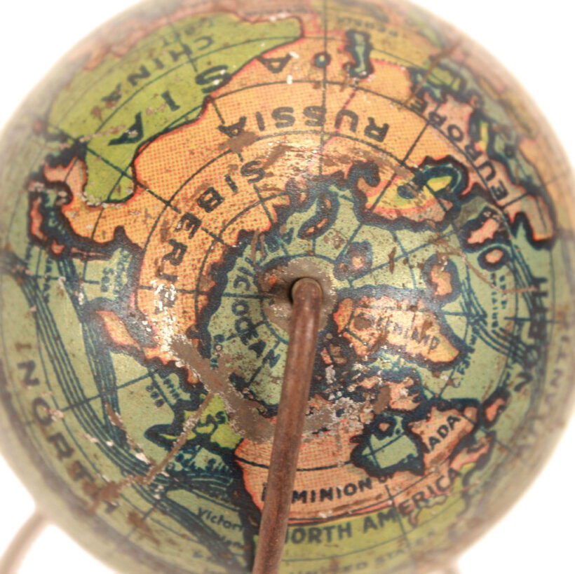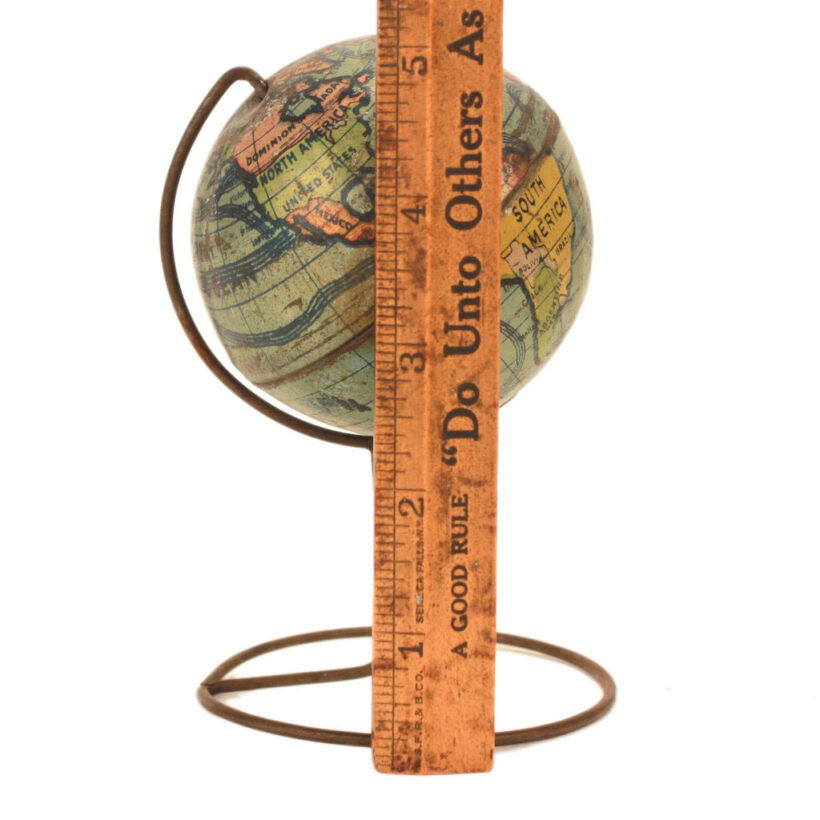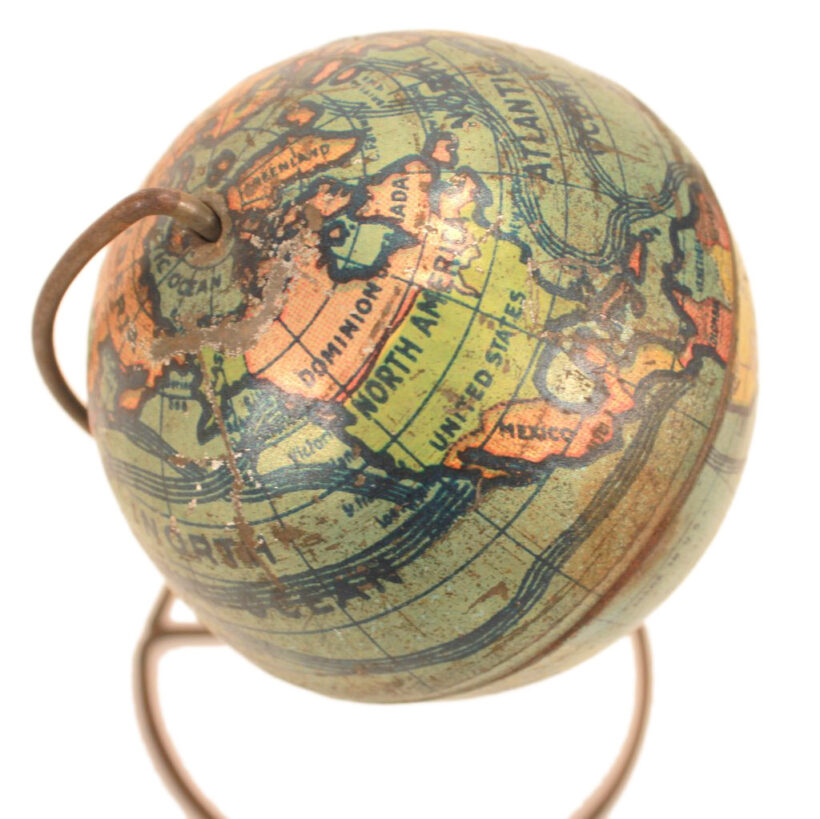 Vintage miniature tin globe — just five inches tall — c. 1920s. Bent wire stand. Good color and patina in a rare size.