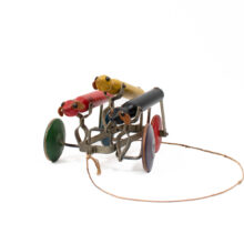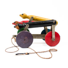 Pleasing pull toy with wheel-driven mechanism that makes the greyhounds move up and down as they sprint forward. An elegant and spare Art Deco design, the dogs are represented as polychrome wooden dowels with leather ears.