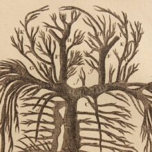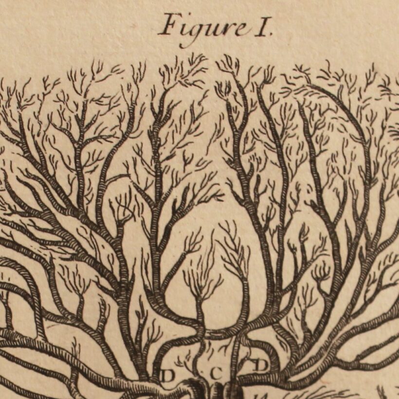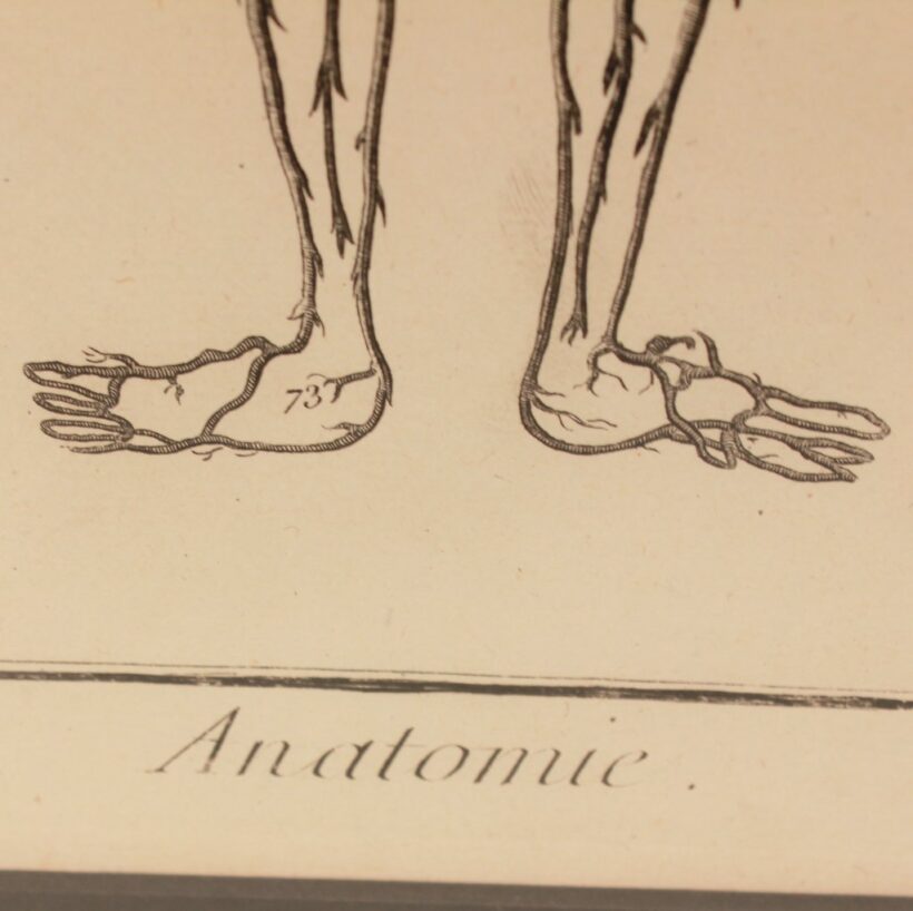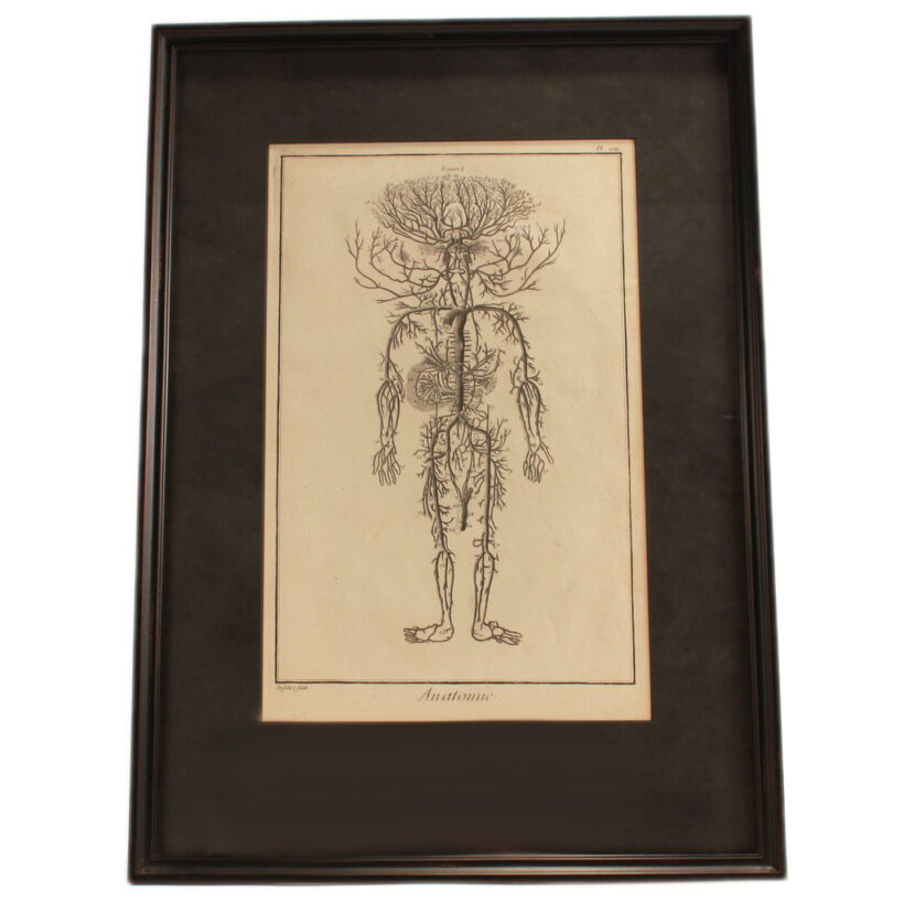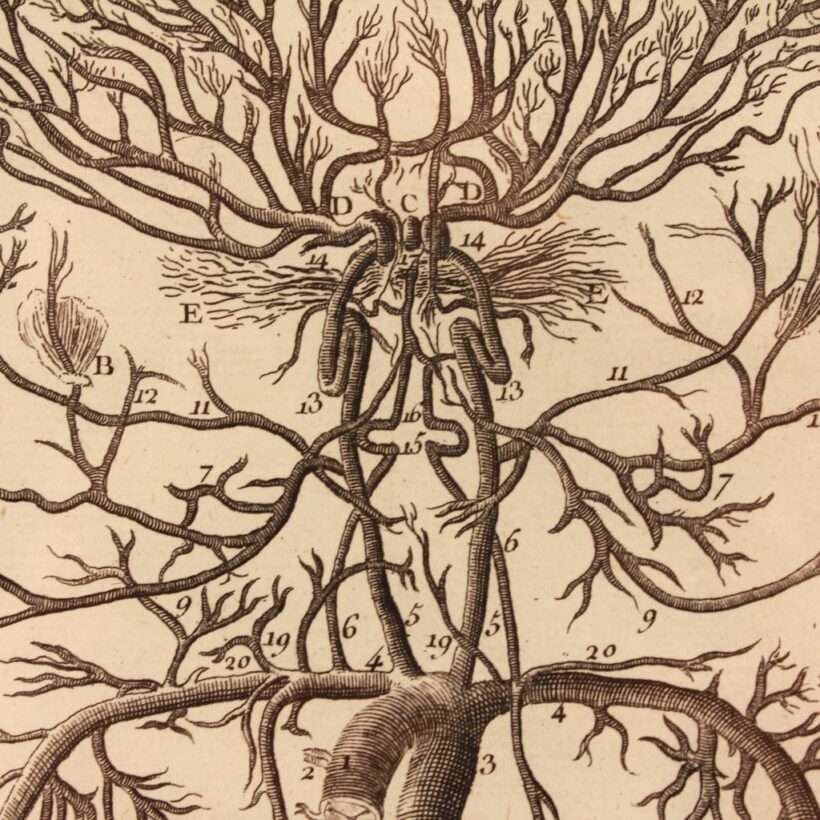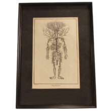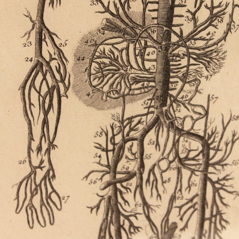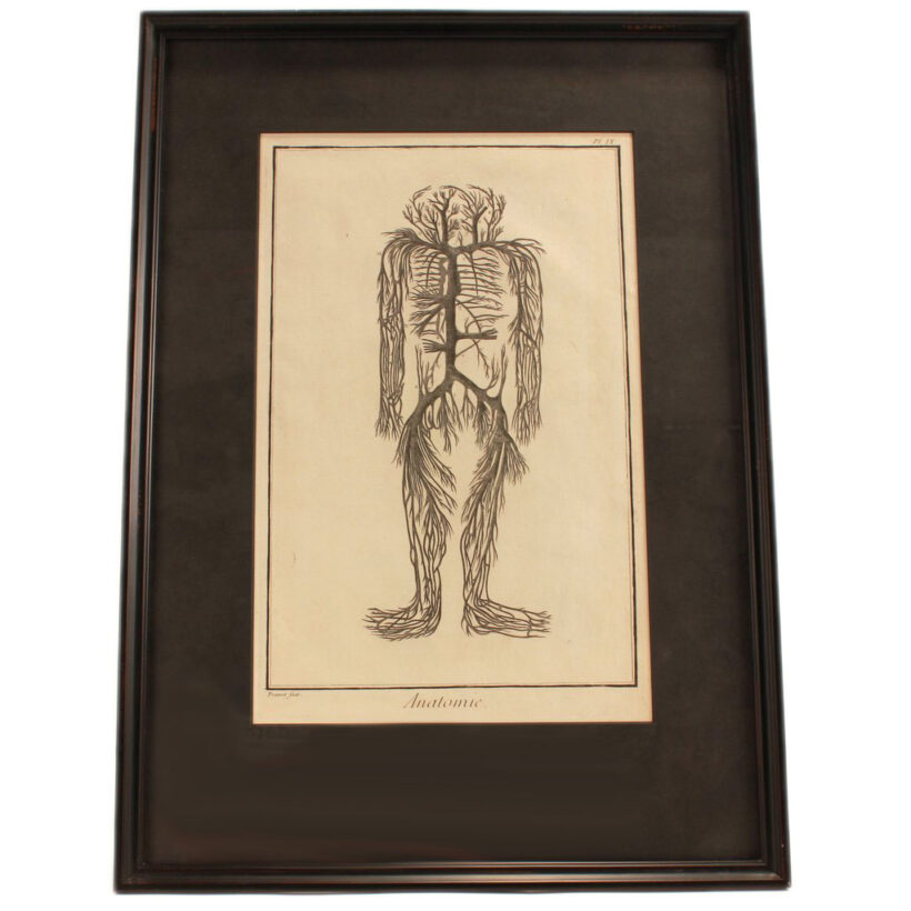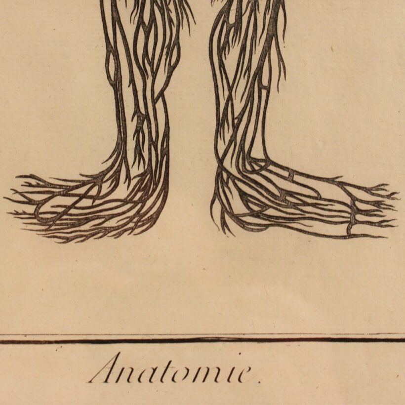 Pair of early anatomical engravings from a French medical treatise, c. mid- to late 18th century. The engravings present the vascular system, the veins and arteries charting the contours of invisible human bodies. But rather than depicting aspects of human anatomy, the surreal and grotesque plates seem to independent, monstrous beings — which are in fact within us.
