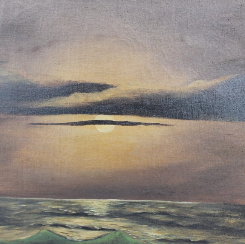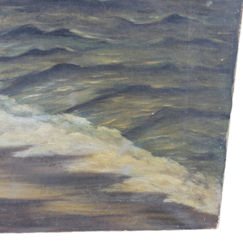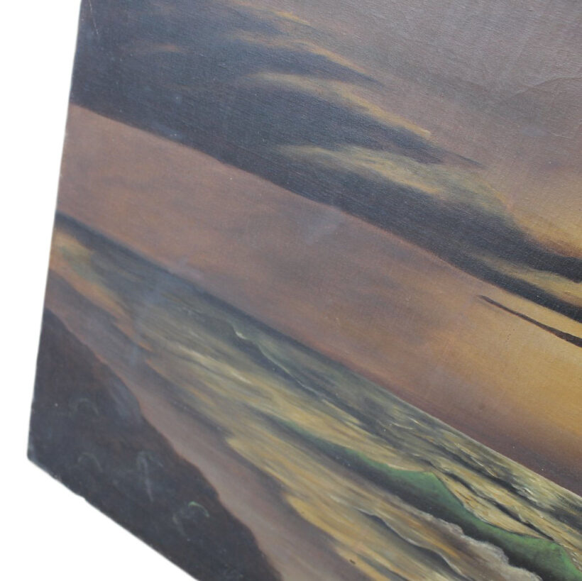 Antique folk art oil on canvas painting of a moonlight-drenched beach, c. late 19th century. The evocative seaside nighttime scene was painted by an amateur hand, and the naïveté of the piece somehow heightens its drama and surreal qualities. An attic find, the painting maintains its timeworn state, which adds to its moody atmosphere and sets it apart as not only a work of art, but an artful old object with a life of its own.