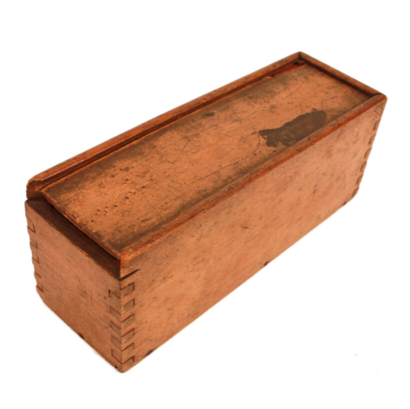 Very good antique condition, with a few minor chips and one lip of the slide top box missing.
