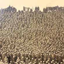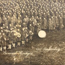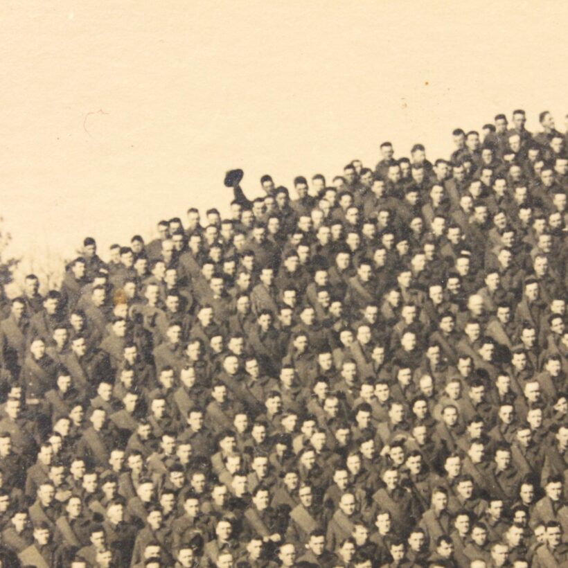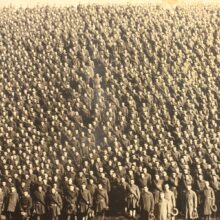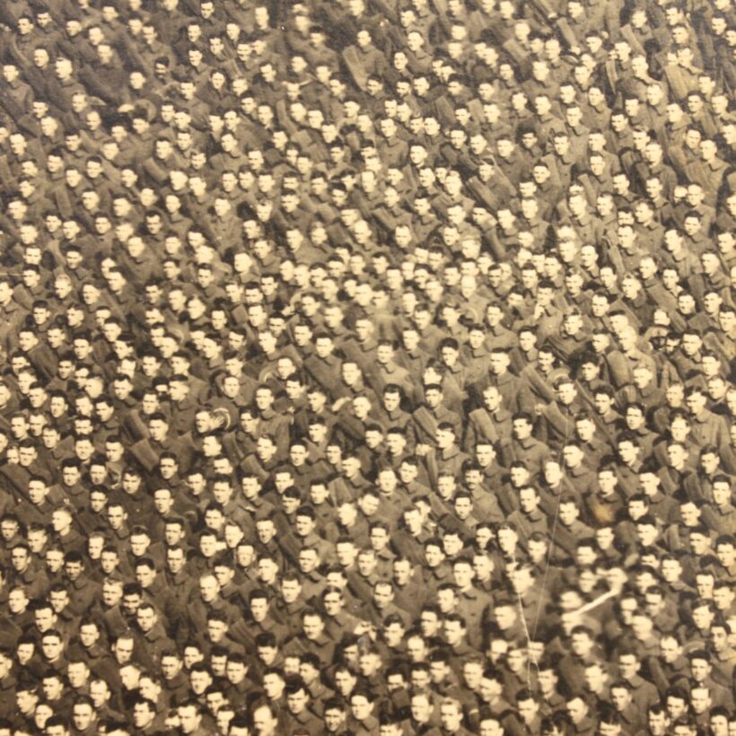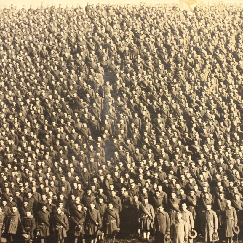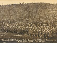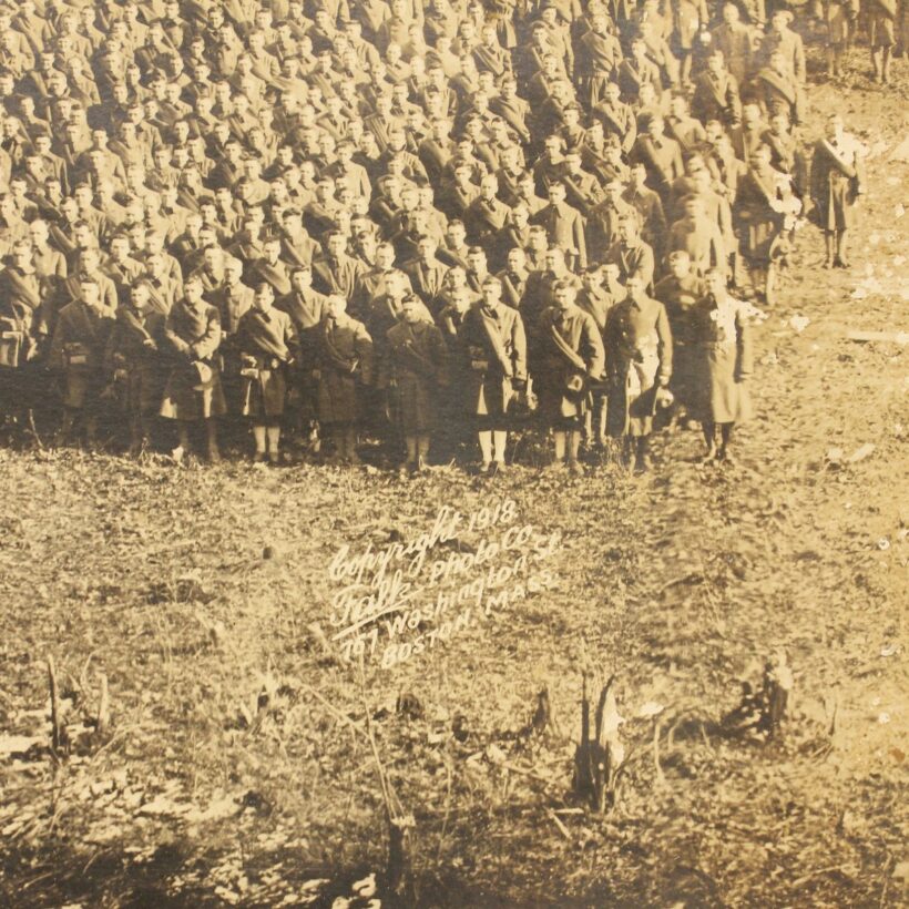 World War I five-foot long panoramic photograph capturing the Plymouth 12th Infantry Division — approximately 10,000 soldiers — dated December 3, 1918 and taken at Camp Devens in Massachusetts. The U.S. Army training facility was a locus of the “Spanish flu” influenza pandemic, and though the Great War was over and these soldiers would never join their comrades on the killing fields of Europe, they still suffered casualties from the global conflict — despite never leaving their home state.