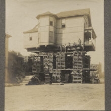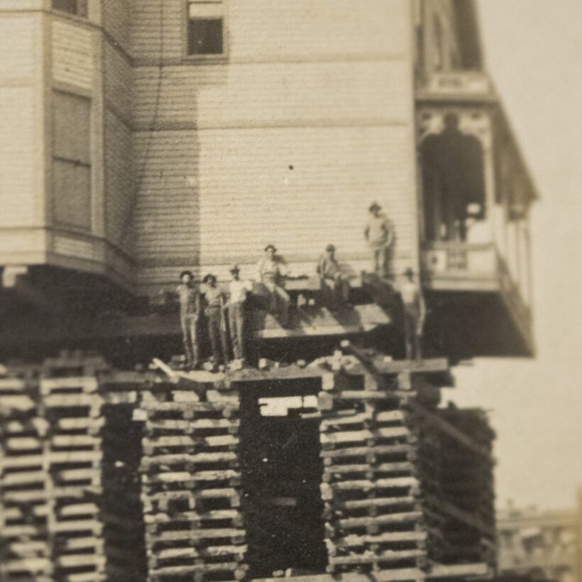 Photograph of house movers / print on board / c. 1900
