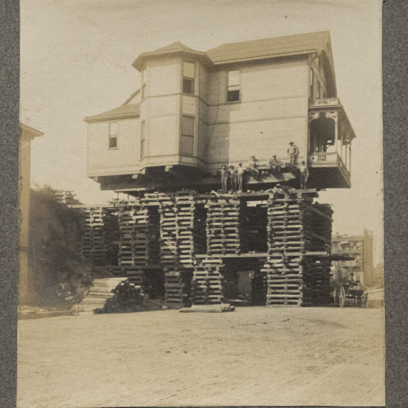Photograph of an Omaha, Nebraska house being moved and lifted, c. early twentieth century.