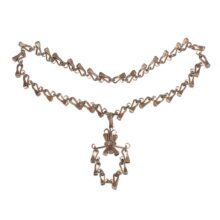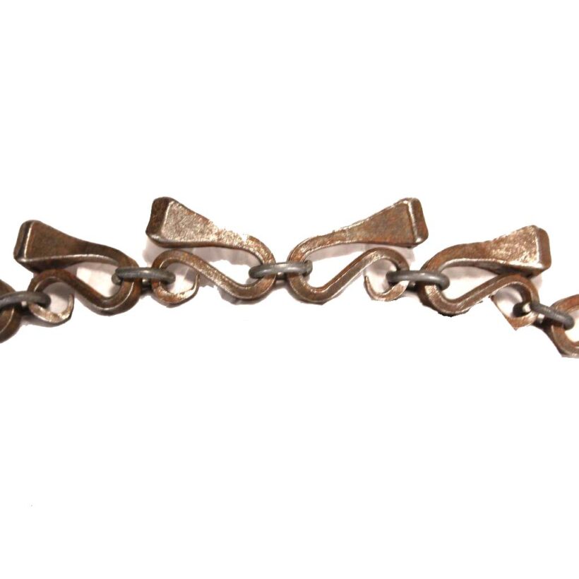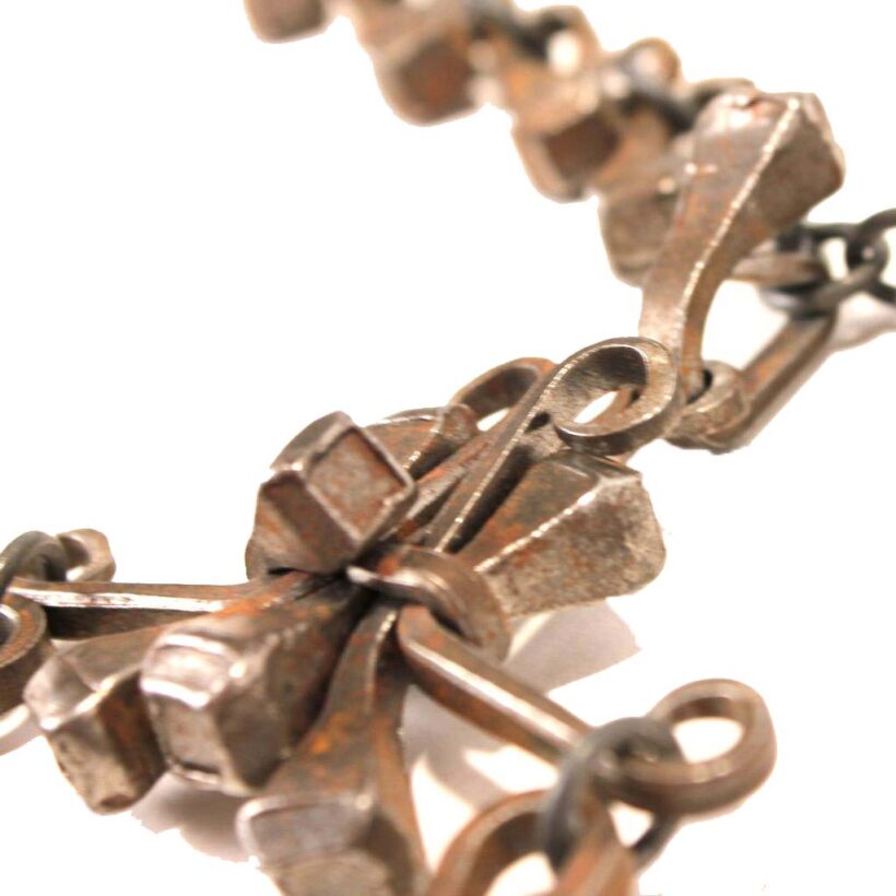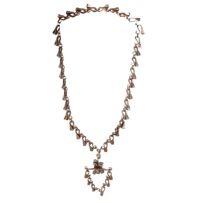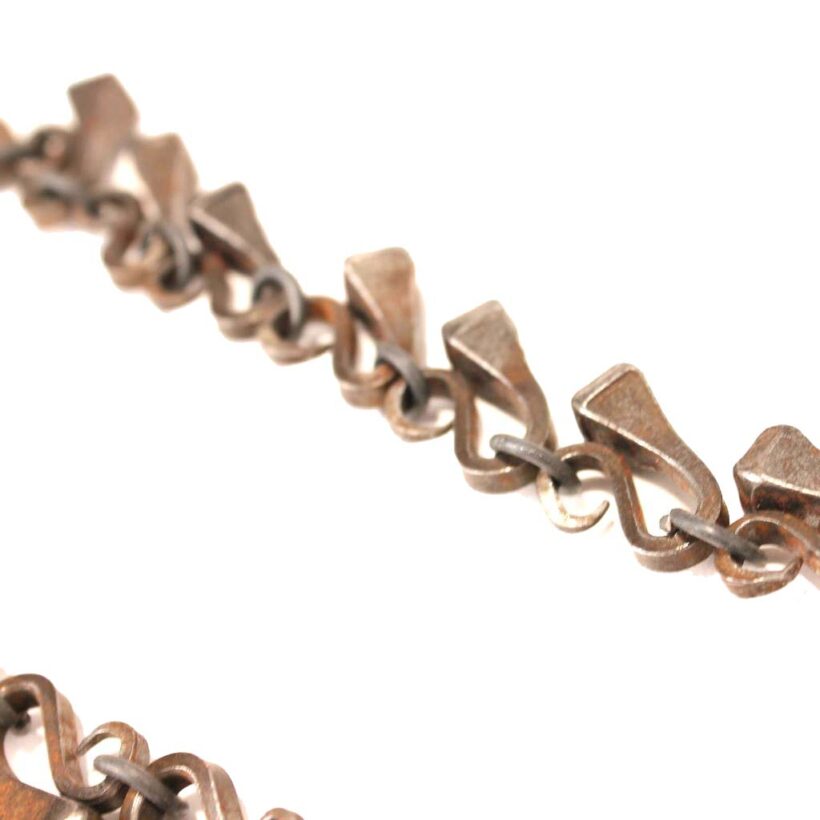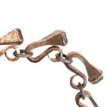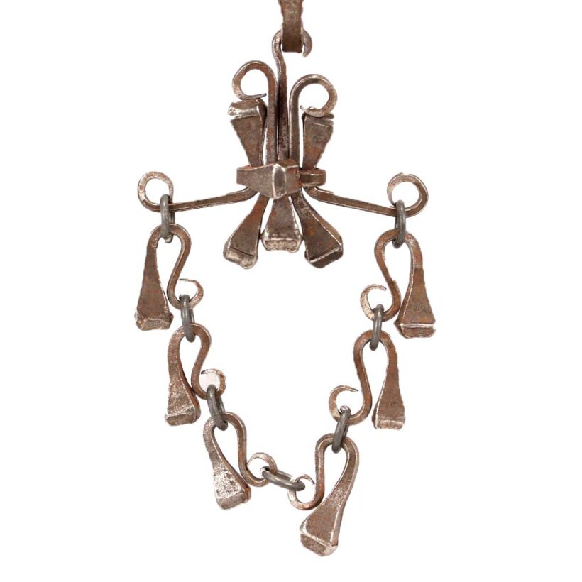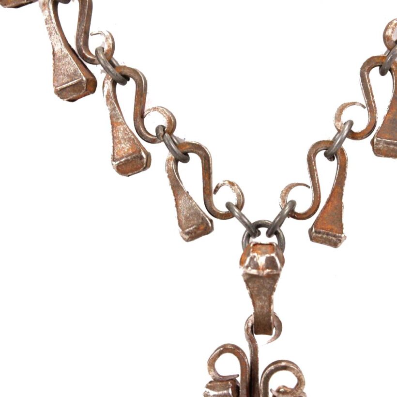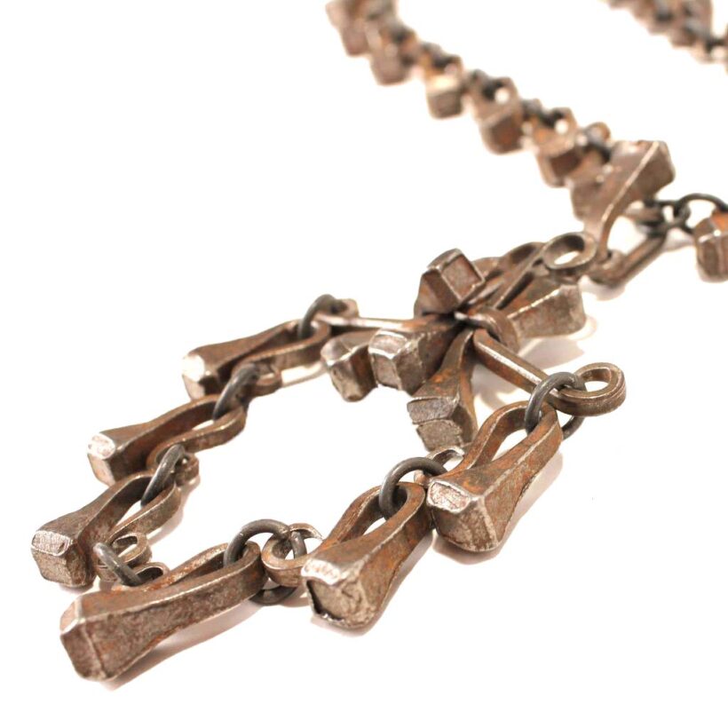 Folk art horseshoe nail necklace, probably blacksmith made, c. early 20th century. The necklace came out of the estate of a prominent folk art collector and was said to originate from upstate New York. It is composed of tapered iron nails meant for fastening horse shoes in place. Each of the carefully bent nails is sculpture when taken alone, and the effect linked together as chain and pendant is at once bold and delicate. Although a necklace of nails might sound painful, each link is worked to curl the point in onto itself, protecting the wearer from the sharp purpose of the retooled hardware. Exact age unknown, but the inventive design and craftsmanship evident in this necklace make it a timeless and a powerful piece of folk art.