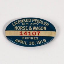 Rare NYC “Horse & Wagon” peddler’s license badge. With its 1919 expiration date — well into the automobile age — the piece embodies a last vestige of old New York and its streets of lower Manhattan teeming with horse-driven carts and wagons by merchants hawking everything from fruit to rags. Apparently a rare badge, I was unable to find another example in my research.
