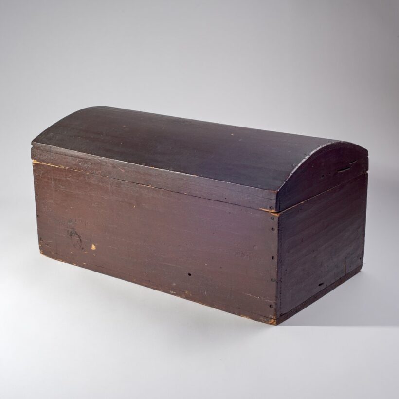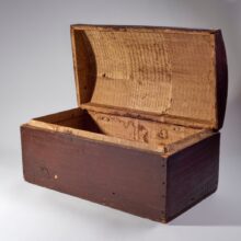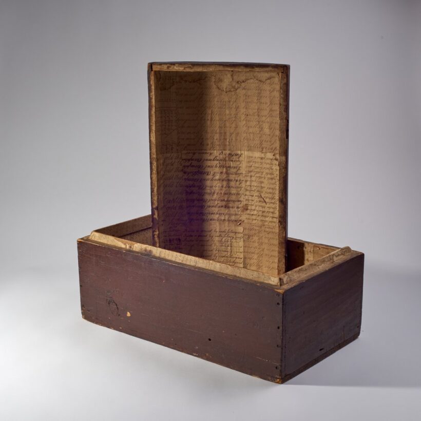 A small, empty wooden trunk, papered inside with leaves from a student’s copybook, Maine, c. first quarter 19th century.