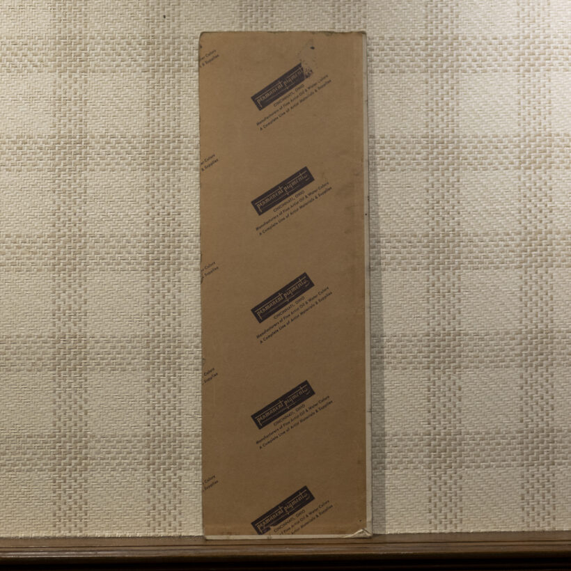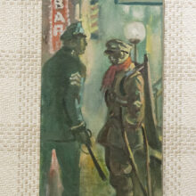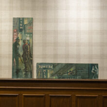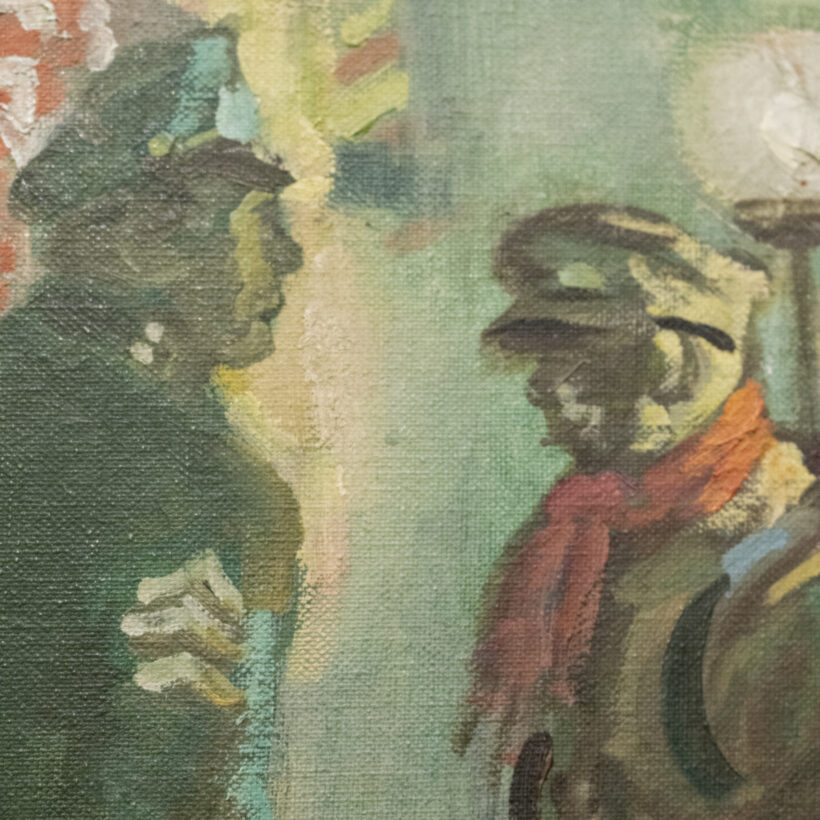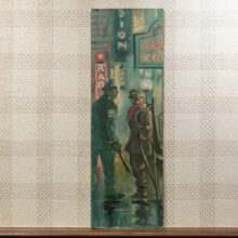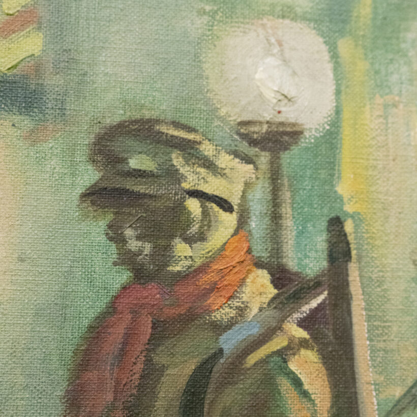 In this dark postwar scene by an unknown artist, a cop appears about to accost a homeless disabled veteran outside of the Bowery Mission in the Lower East Side. Although the composition of this oil on board is powerful, it may have been accidental — at some point the painting was cut down, possibly with the missing portion cut to be recycled as another painting. Now with two pieces of the original board remaining, the altered work stands on its own merits as a compelling found object.