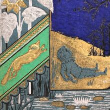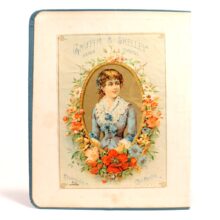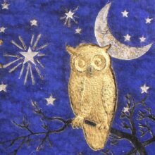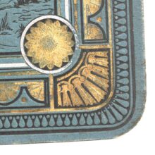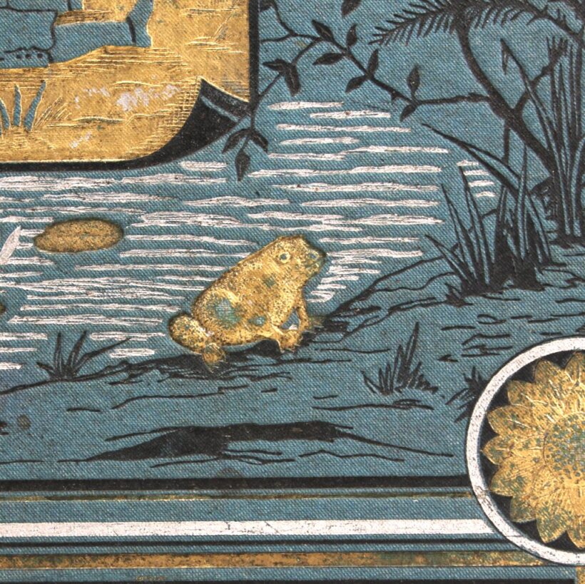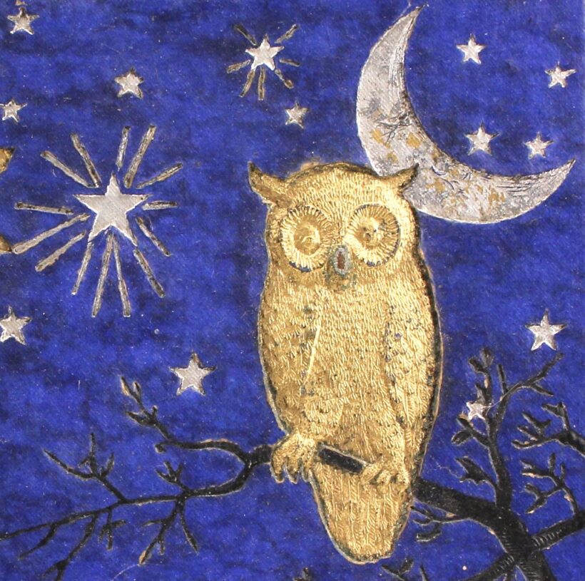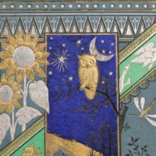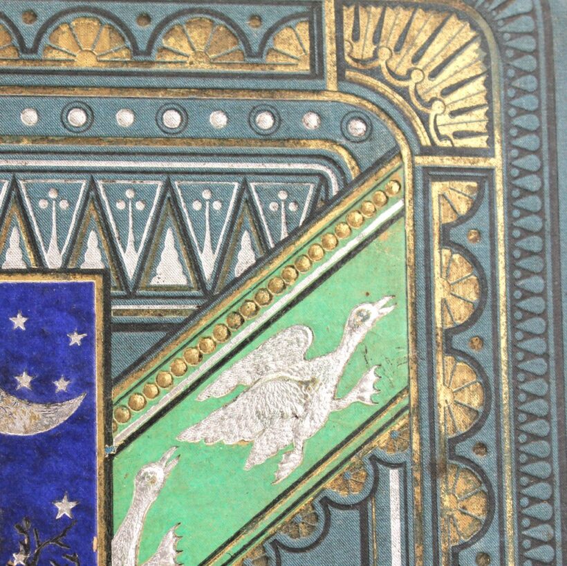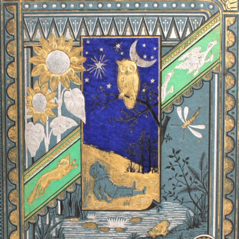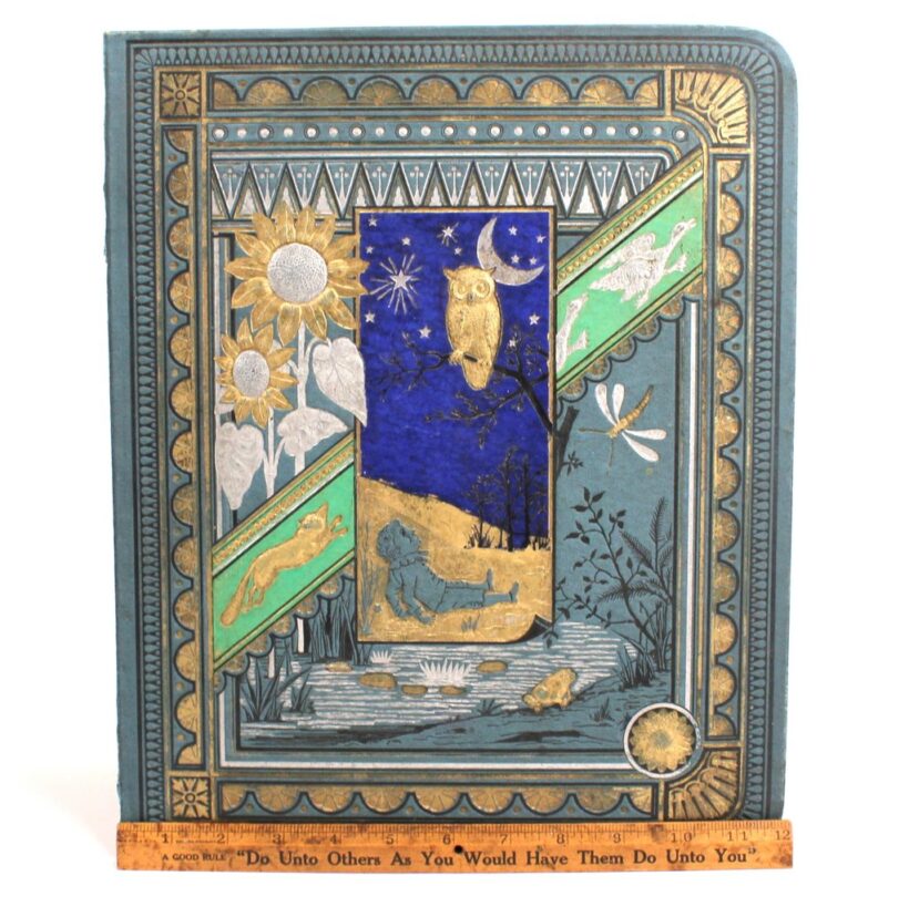 Antique Victorian scrapbook album cover, c. 1870s. Elaborately embossed and painted paperboard. Bold and whimsical Aesthetic movement design, with all manner of creatures, from the distinctive gilded owl on his perch to the fox on the chase. The colors are stunning. Under those embossed silver stars, the saturated blue pigment has such richness and depth it almost seems like the night sky itself. Reverse side has a Victorian tradecard pasted onto the board. The scrapbook itself has long vanished, but its luminous and delightfully eccentric cover remains with us.