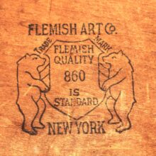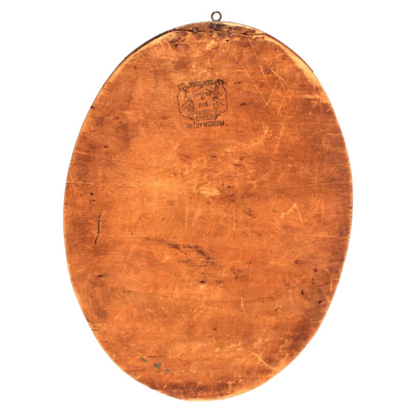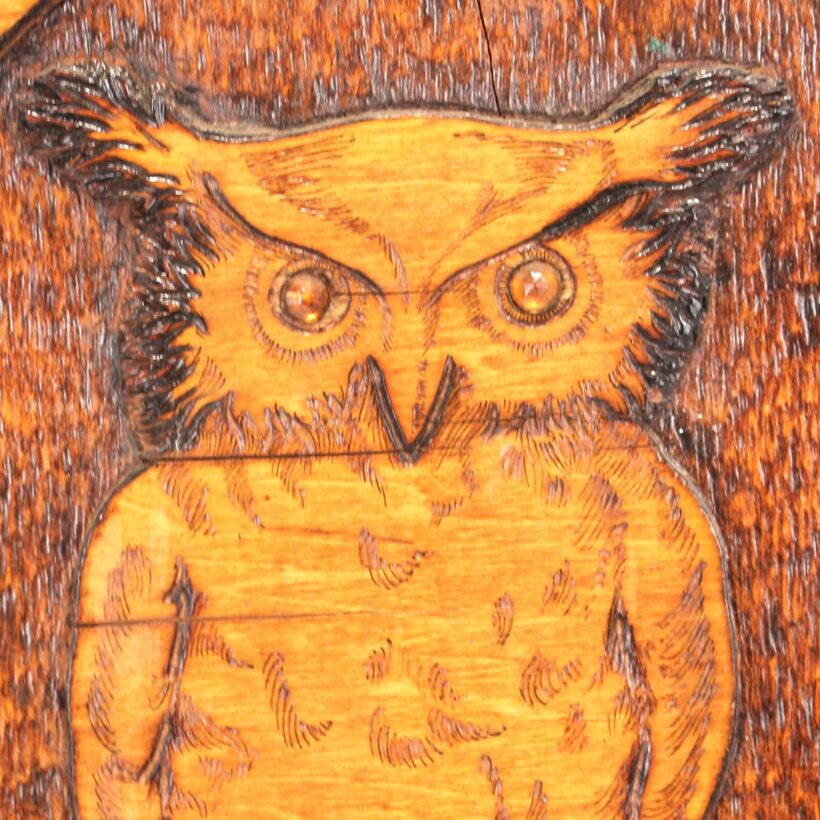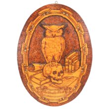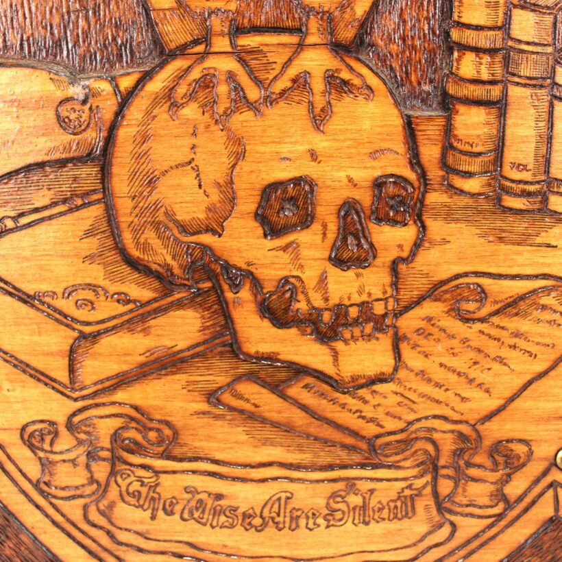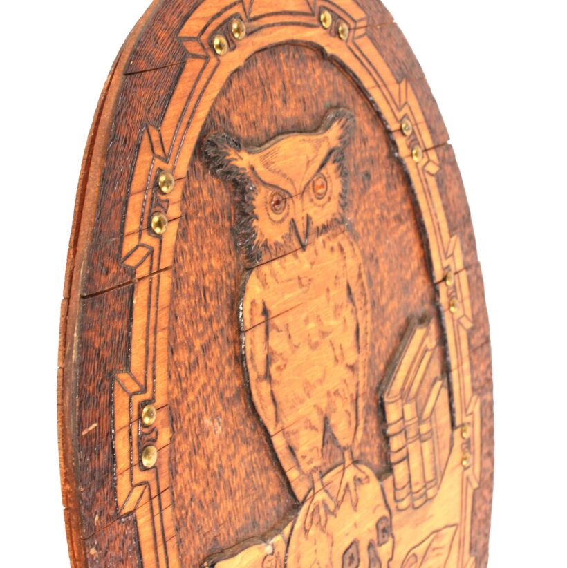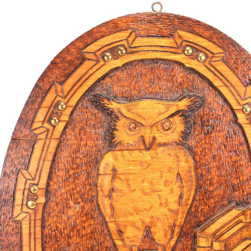 Antique pyrography owl and skull panel, c. 1900. From a learned library setting of books and scrolls, the glass-eyed owl standing atop a human skull imparts the ominous motto unfurling below: “The Wise are Silent.” Pyrography is an art form which uses wood burning to create its designs. This panel is especially elaborate, achieving a three-dimensional effect with layered plywood, decorative brass tacks, and the owl’s glass eyes. It bears a stamp on the reverse with the maker’s mark of the Flemish Art Company of Brooklyn, New York, whose name became synonymous with this popular art form in the late 19th and early 20th century.