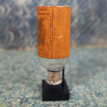 With the label applied upside-down — most easily read as you hurriedly downed the medication — I mounted the bottle on a miniature stand (unattached but held fast by wire arms).