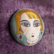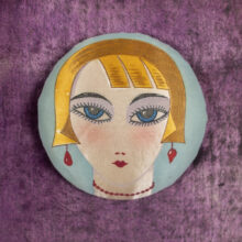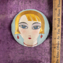 Hand-painted silk Art Deco flapper portrait on a miniature circular cushion, likely intended for pins or jewelry but apparently too beautiful to pierce given her unblemished complexion. She’s lovely displayed on a shelf, but would look stunning framed and shadowboxed.